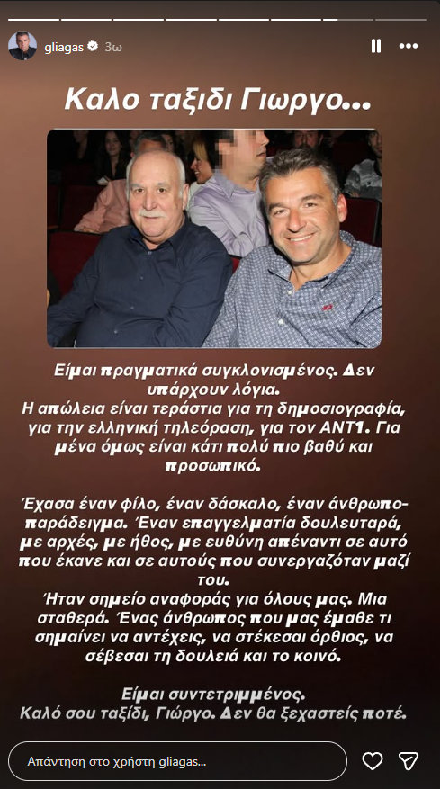 «Γιώργο μου, o θάνατός σου μας σόκαρε όλους. Ήταν τόσο ξαφνικός και τόσο άδικος, που ακόμη και σήμερα η σκέψη δυσκολεύεται να τον αποδεχτεί. Το σοκ μπλέκεται με μια βαθιά, σιωπηλή θλίψη και μια ερώτηση επιστρέφει επίμονα στο μυαλό μου: πρόλαβες να ζήσεις;» – Δες περισσότερα στο blog της Τατιάνας Στεφανίδου.