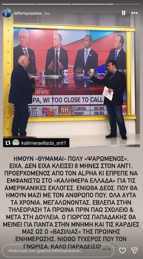 Με ανακοίνωσή του στα media ο πρόεδρος του Ομίλου ANTENNA Θοδωρής Κυριακού αποχαιρέτησε τον δημοσιογράφο, ο οποίος επί 34 χρόνια έλεγε την πρώτη καλημέρα στους τηλεθεατές του ANT1.