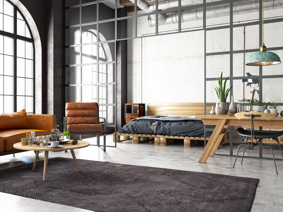 Στο industrial τα έπιπλα δεν είναι ποτέ τυχαία. Μεταλλικά κομοδίνα, τσιμεντένια τραπεζάκια ή ξύλινα κομμάτια με μεταλλικές λεπτομέρειες δίνουν τον τόνο. Για να μαλακώσεις το σύνολο, πρόσθεσε και μια vintage πολυθρόνα από δέρμα ή ένα χαλί που να έχει ήδη ιστορία. Η μίξη του σκληρού με το απαλό είναι το κλειδί.