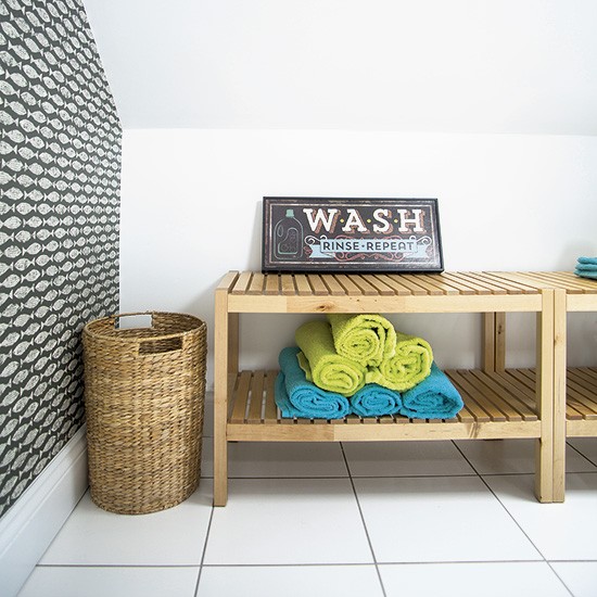 Όσο μικρό και να είναι το μπάνιο σου υπάρχει τρόπος να τα χωρέσει όλα. Εδώ βλέπεις ότι οι αποθηκευτικοί χώροι απλώνονται προς τα πάνω. Επίσης στρατηγική είναι η τοποθέτηση κρεμάστρας πάνω από το καλοριφέρ για να στεγνώνουν οι πετσέτες το χειμώνα!