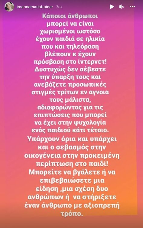 «Κάποιοι άνθρωποι μπορεί να είναι χωρισμένοι ωστόσο έχουν παιδιά σε ηλικία που και τηλεόραση βλέπουν και έχουν πρόσβαση στο ίντερνετ! Δυστυχώς δεν σέβεστε την ύπαρξή τους και ανεβάζετε προσωπικές στιγμές τρίτων εν αγνοία τους μάλιστα, αδιαφορώντας για τις επιπτώσεις που μπορεί να έχει στην ψυχολογία ενός παιδιού κάτι τέτοιο.