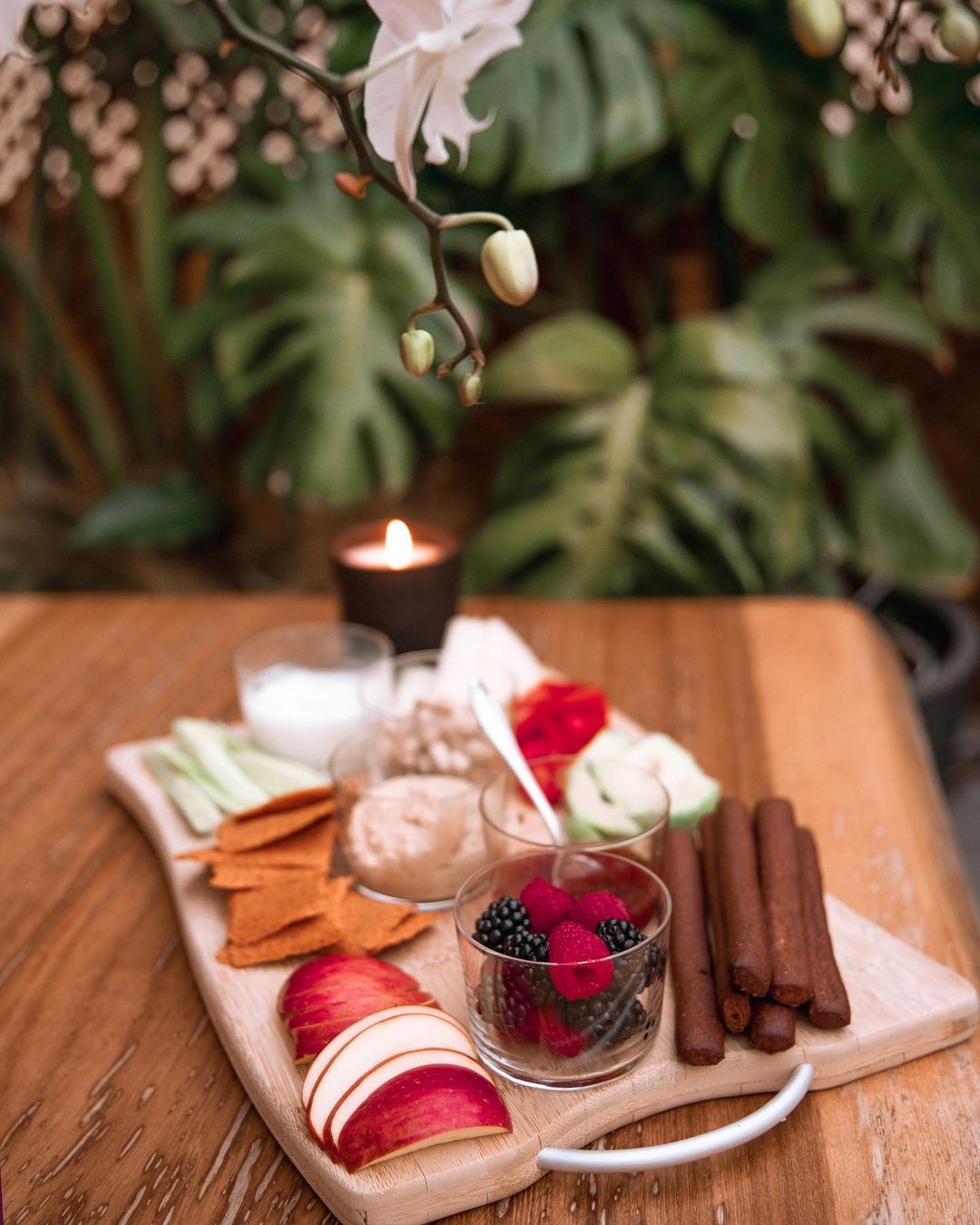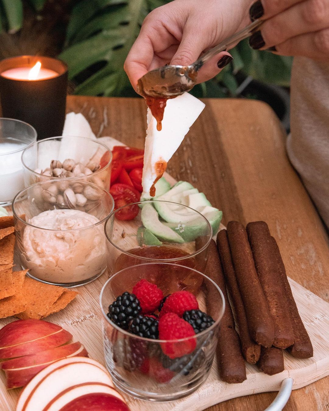 Ο δίσκος μου έχει τυρί, ντοματίνια, αβοκάντο, πρόβειο γιαούρτι, χούμους, μαρμελάδα φράουλα χωρίς ζάχαρη, μούρα, κριτσίνια χαρουπιού, φυστίκια αιγίνης, αγγουράκι, μήλο, κράκερ αμυγδάλου.
