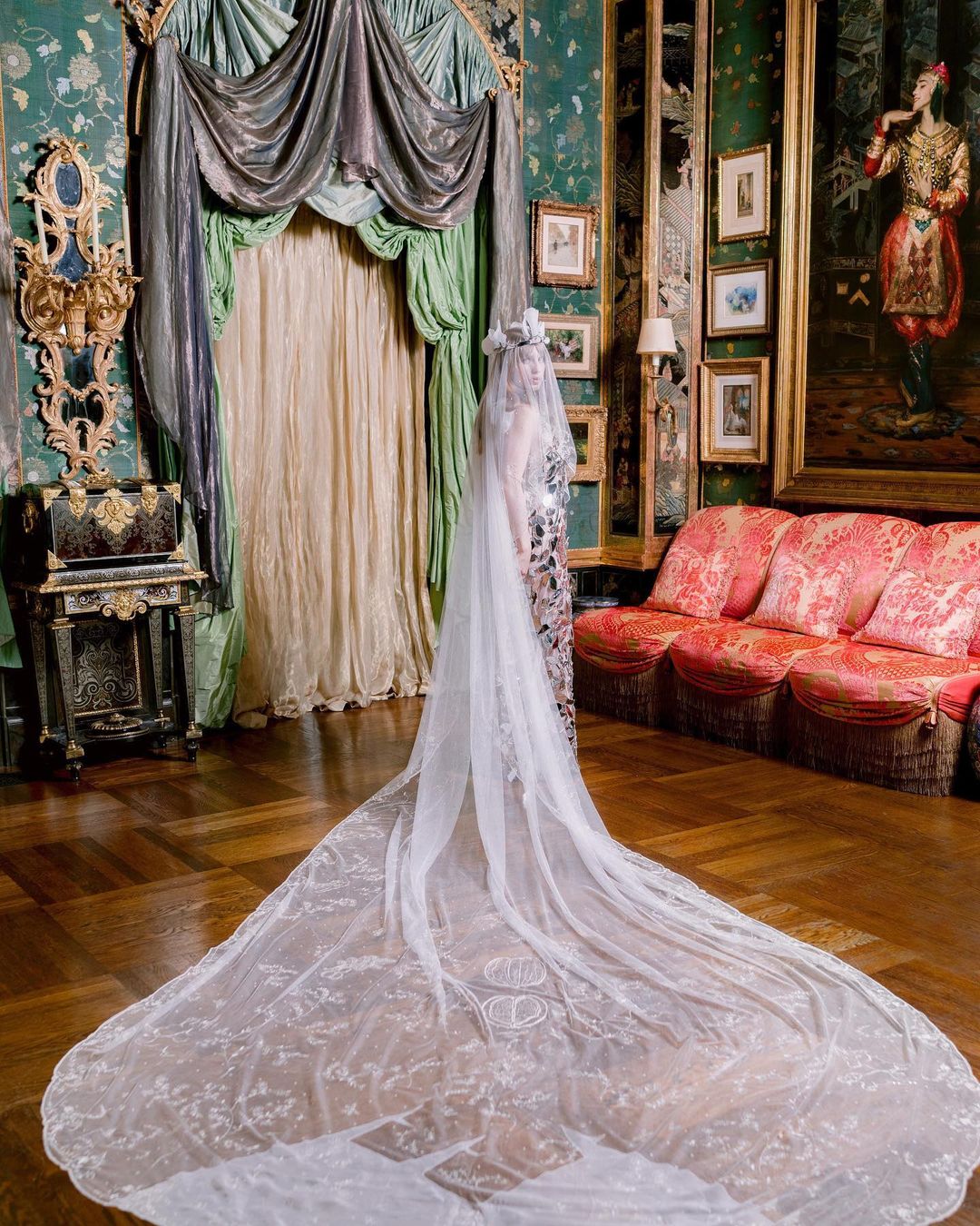 Η ίδια πέτυχε μια άκρως εντυπωσιακή εμφάνιση για το νυφικό της look, αφού επέλεξε ένα «γυάλινο» φόρεμα κατά παραγγελία με την υπογραφή του Τζον Γκαλιάνο.