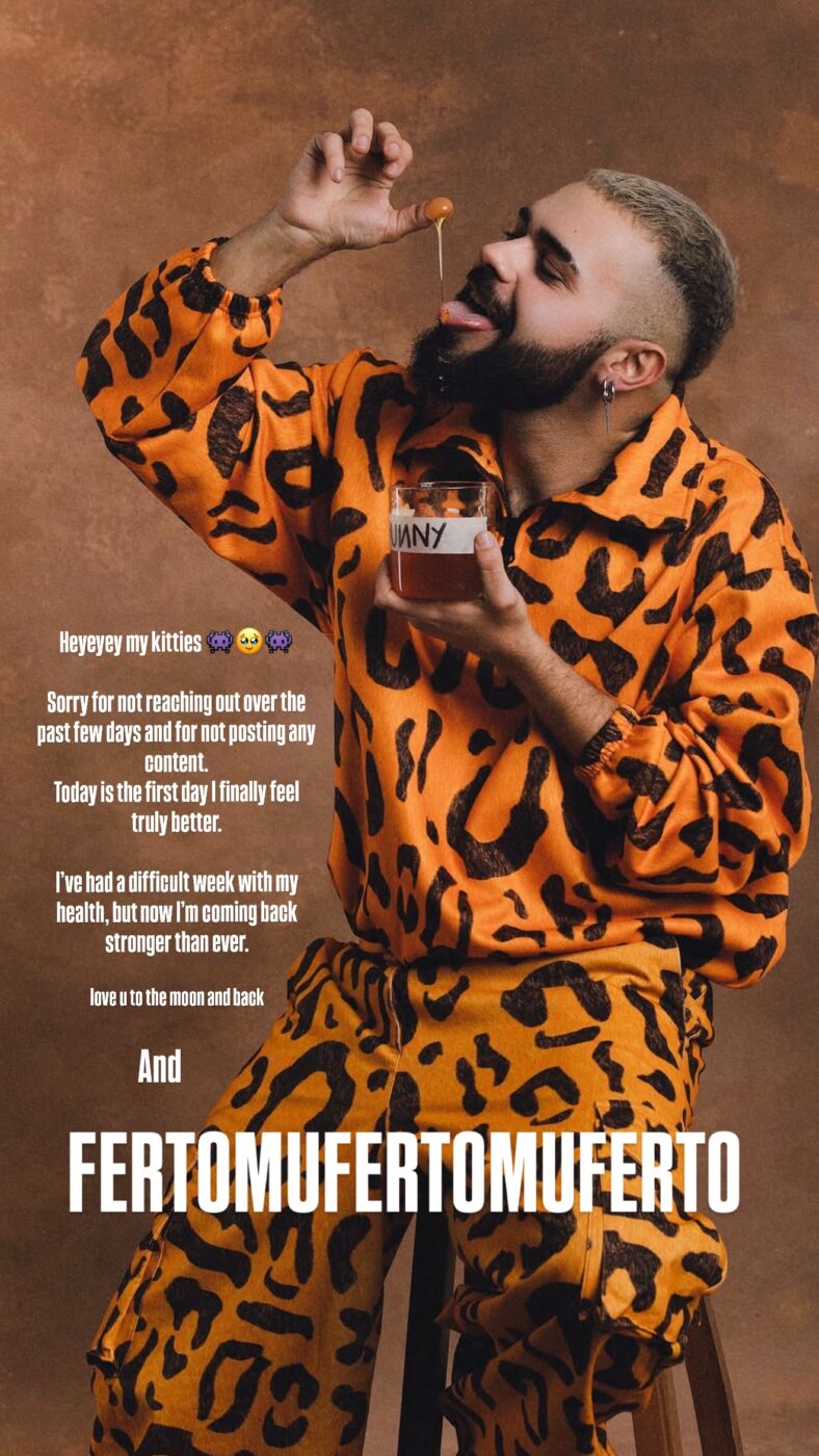 «Συγγνώμη που δεν επικοινώνησα τις τελευταίες ημέρες και που δεν ανέβασα καθόλου περιεχόμενο. Σήμερα είναι η πρώτη μέρα που επιτέλους νιώθω πραγματικά καλύτερα. Πέρασα μια δύσκολη εβδομάδα με την υγεία μου, αλλά τώρα επιστρέφω πιο δυνατός από ποτέ. Σας αγαπώ μέχρι το φεγγάρι και πίσω» έγραψε ο καλλιτέχνης στα Instagram Stories του.