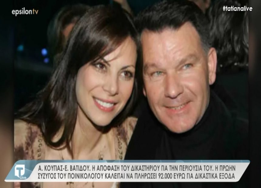 Αυλαία φαίνεται πως έπεσε τελικά στην πολύκροτη διαμάχη του Αλέξη Κούγια με την Εύη Βατίδου για τα περιουσιακά στοιχεία που αποκτήθηκαν όταν ήταν παντρεμένοι. Η πρώην εστεμμένη διεκδικούσε από τον γνωστό ποινικολόγο το ένα τρίτο από τα αποκτήματα του κατά τη διάρκεια του έγγαμου βίου τους.