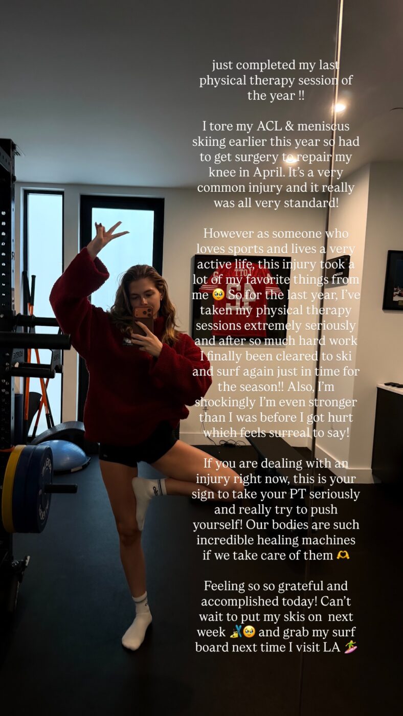 «Μόλις ολοκλήρωσα την τελευταία συνεδρία φυσικοθεραπείας για φέτος! Νωρίτερα μέσα στη χρονιά έπαθα ρήξη χιαστού και μηνίσκου κάνοντας σκι, οπότε χρειάστηκε να κάνω χειρουργείο στο γόνατό μου τον Απρίλιο. Είναι ένας πολύ συνηθισμένος τραυματισμός και, ειλικρινά, όλα ήταν αρκετά τυπικά!