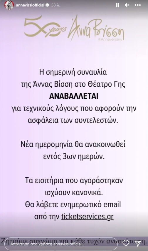 «Η σημερινή συναυλία της Άννας Βίσση στο Θέατρο Γης αναβάλλεται για τεχνικούς λόγους που αφορούν την ασφάλεια των συντελεστών. Νέα ημερομηνία θα ανακοινωθεί εντός 3 ημερών. Τα εισιτήρια που αγοράστηκαν ισχύουν κανονικά, ζητούμε συγγνώμη για τυχόν αναστάτωση», αναφέρει χαρακτηριστικά η ανακοίνωση της εταιρίας παραγωγής.