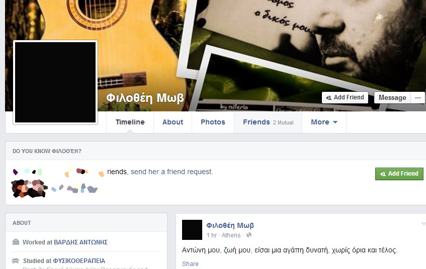 Η Φιλοθέη που ήταν χρόνια η σύντροφος του μεγάλου μας τραγουδοποιού, μέσα από τη σελίδα της στο facebook, αποχαιρέτησε τον αγαπημένο της με τον δικό της συγκινητικό τρόπο βάζοντας φωτογραφία προφίλ μαύρο φόντο και γράφοντας: