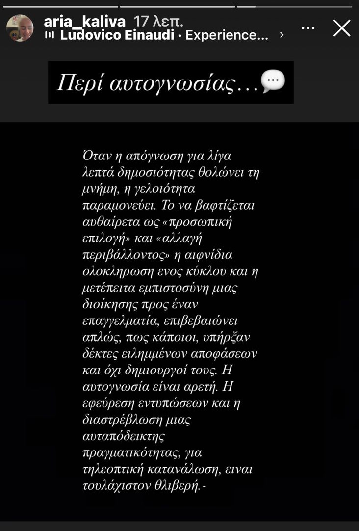 Η αυτογνωσία είναι αρετή. Η εφεύρεση εντυπώσεων και η διαστρέβλωση μιας αναπόδεικτης πραγματικότητας, για τηλεοπτική κατανάλωση, είναι τουλάχιστον θλιβερή.-» έγραψε η Άρια Καλύβα.