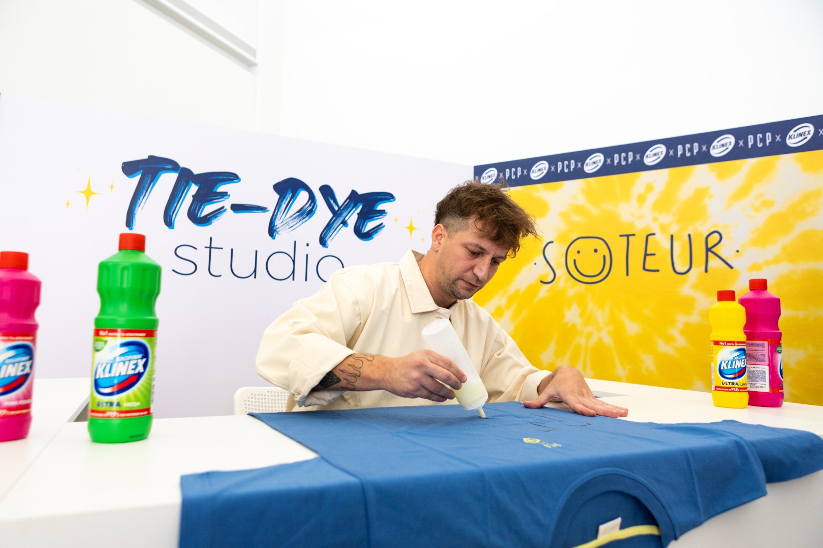 Ένα από τα highlights της βραδιάς ήταν το tie-dye booth, όπου ο γνωστός καλλιτέχνης Soteur μετέτρεψε τη χλωρίνη Klinex σε εργαλείο τέχνης. Μπροστά στα μάτια των καλεσμένων, η δύναμη της χλωρίνης έγινε δημιουργία: πινελιές, στάλες και μοτίβα πάνω σε λευκά μπλουζάκια PCP, που μεταμορφώνονταν σε μοναδικά κομμάτια μόδας.