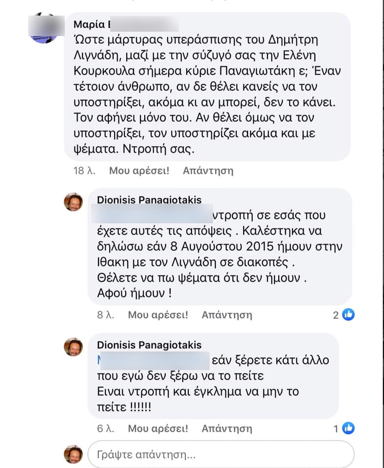 Το σχόλιο που αναδημοσίευσε ο ίδιος με την απάντησή του ήταν το εξής: “Ώστε μάρτυρας υπεράσπισης του Δημήτρη Λιγνάδη, μαζί με την σύζυγό σας την Ελένη Κουρκουλα σήμερα κύριε Παναγιωτάκη ε; Έναν τέτοιον άνθρωπο, αν δε θέλει κανείς να τον υποστηρίξει, ακόμα κι αν μπορεί, δεν το κάνει. Τον αφήνει μόνο του. Αν θέλει όμως να τον υποστηρίξει, τον υποστηρίζει ακόμα και με ψέματα. Ντροπή σας”.