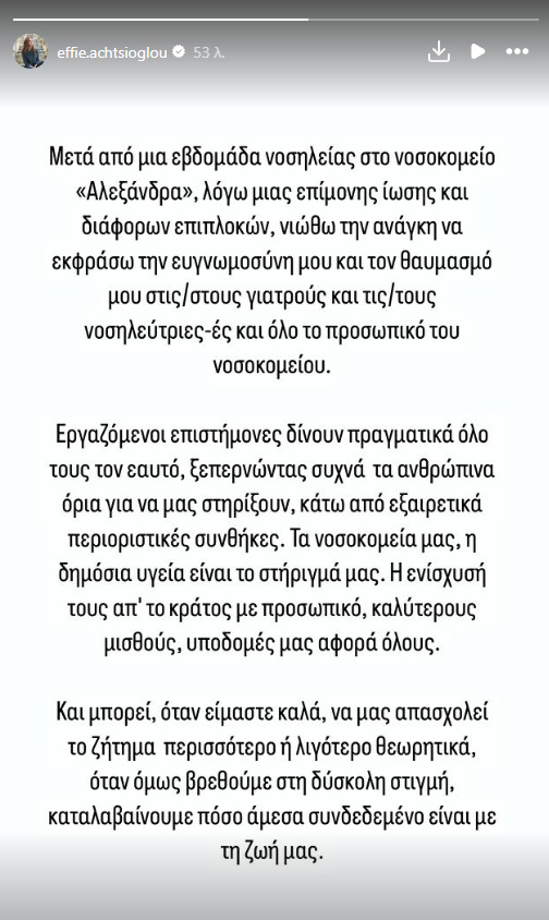 Η Έφη Αχτσιόγλου έγραψε χαρακτηριστικά: «Μετά από μια εβδομάδα νοσηλείας στο νοσοκομείο «Αλεξάνδρα», λόγω μιας επίμονης ίωσης και διάφορων επιπλοκών, νιώθω την ανάγκη να εκφράσω την ευγνωμοσύνη μου και τον θαυμασμό μου στις/στους γιατρούς και τις/τους νοσηλεύτριες-ές και όλο το προσωπικό του νοσοκομείου. Εργαζόμενοι επιστήμονες δίνουν πραγματικά όλο τους τον εαυτό, ξεπερνώντας συχνά τα ανθρώπινα όρια για να μας στηρίξουν, κάτω από εξαιρετικά περιοριστικές συνθήκες. Τα νοσοκομεία μας, η δημόσια υγεία είναι το στήριγμά μας.