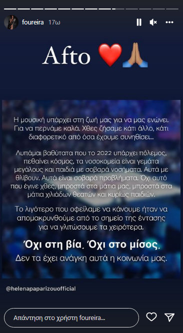 Αυτά με θλίβουν. Αυτά είναι σοβαρά προβλήματα. Όχι αυτό που έγινε χθες , μπροστά στα μάτια μας, μπροστά στα μάτια χιλιάδων θεατών και κυρίως παιδιών. Το λιγότερο που οφείλαμε να κάνουμε ήταν απομακρυνθούμε από το σημείο της έντασης για να γλιτώσουμε τα χειρότερα. Όχι στην βία, όχι στο μίσος. Δεν τα έχει ανάγκη αυτά η κοινωνία μας», έγραψε η Έλενα Παπαρίζου στο instagram.