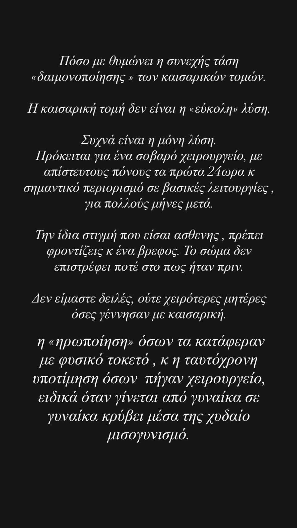 Συχνά είναι η μόνη λύση. Πρόκειται για ένα σοβαρό χειρουργείο, με απίστευτους πόνους τα πρώτα 24ωρα και σημαντικό περιορισμό σε βασικές λειτουργίες, για πολλούς μήνες μετά. Την ίδια στιγμή που είσαι ασθενής, πρέπει να φροντίζεις κι ένα βρέφος. Το σώμα δεν επιστρέφει ποτέ στο πώς ήταν πριν. Δεν είμαστε δειλές, ούτε χειρότερες μητέρες όσες γέννησαν με καισαρική.
