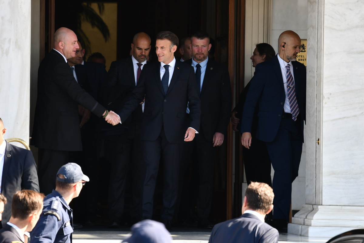 Κατά την έξοδό του από το ξενοδοχείο ο Εμανουέλ Μακρόν ήταν ιδιαιτέρως χαμογελαστός και ευδιάθετος. Αφού χάρισε έναν ευγενικό χαιρετισμό σε κάμερες και φωτογράφους που βρίσκονταν εκεί, επιβιβάστηκε στο αυτοκίνητό του προκειμένου να μεταβεί στον Πειραιά.