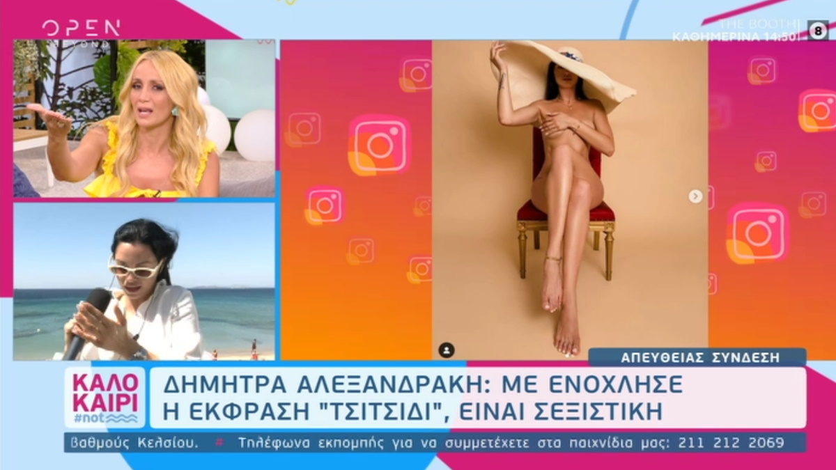 Ένταση προκλήθηκε, το πρωί της Τετάρτης, στον αέρα του «Καλοκαίρι #Not», όταν βγήκε ζωντανά στην εκπομπή, μέσω Skype, η Δήμητρα Αλεξανδράκη. Μεταξύ άλλων, η μελαχρινή καλλονή αναφέρθηκε σε κάποια σχόλια που έγιναν χθες από τη Ναταλί Κάκκαβα, σχετικά με τη γυμνή φωτογραφία που δημοσίευσε στο Instagram. Η Δήμητρα τοποθετήθηκε με έντονο ύφος επί του θέματος, με τη Ναταλί να διευκρινίζει τι ακριβώς εννοούσε και τον Γρηγόρη Γκουντάρα να παρεμβαίνει για να κατευνάσει τα πνεύματα.
