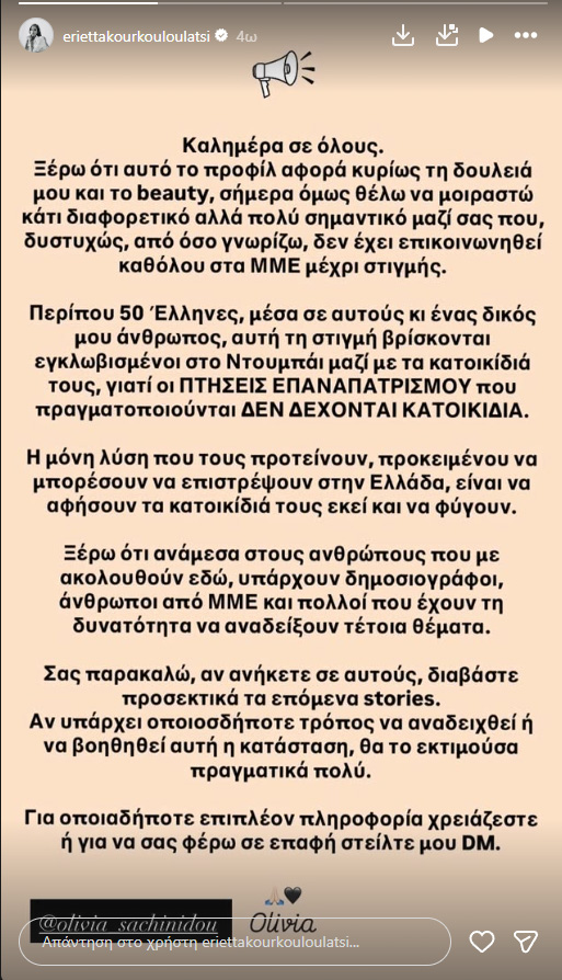Σας παρακαλώ, αν ανήκετε σε αυτούς, διαβάστε προσεκτικά τα επόμενα stories. Αν υπάρχει οποιοσδήποτε τρόπος να αναδειχθεί ή να βοηθηθεί αυτή η κατάσταση, θα το εκτιμούσα πραγματικά πολύ. Για οποιαδήποτε επιπλέον πληροφορία χρειάζεστε ή για να σας φέρω σε επαφή, στείλτε μου DM» αναφέρει στην ανάρτησή της η Εριέττα Κούρκουλου.