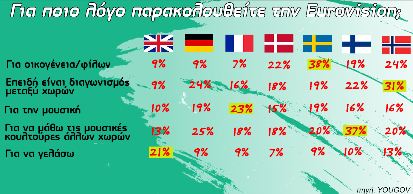 Αυτό ήταν το δεύτερο ερώτημα της έρευνας και αποκαλύπτεται πως για κάθε χώρα ο λόγος για τον οποίο οι τηλεθεατές βλέπουν την Eurovision είναι διαφορετικός. Για την Φινλανδία είναι μία οικογενειακή υπόθεση, για τους Νορβηγούς τα πράγματα είναι πιο…πατριωτικά, για τους Γάλλους αφορά την μουσική τους παιδεία, για τους Φινλανδούς η γνωριμία με τους άλλους λαούς ενώ για τους Άγγλους αποτελεί μια βραδιά … γέλιου. (μην ξεχνάμε ότι ο σχολιαστής που μεταδίδει την Eurovision στην Αγγλία αποτελεί ένας από τους μεγαλύτερους κωμικούς παρουσιαστές).
