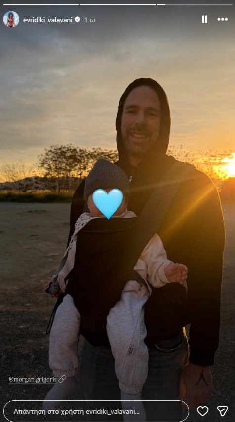 Στη νέα φωτογραφία, ο Γρηγόρης Μόργκαν ποζάρει με φόντο το ηλιοβασίλεμα έχοντας στην αγκαλιά του στο μάρσιπο τον μόλις 9 μηνών γιο του.