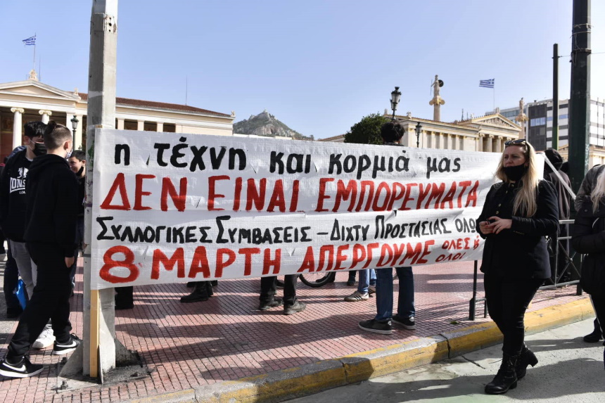 Στο κέντρο της Αθήνας και την πορεία που διοργάνωσε ο Σύλλογος Ελλήνων Μουσικών στο κέντρο της Αθήνας. Οι Έλληνες καλλιτέχνες μετά την κατάθεση του νέου νομοσχεδίου στη Βουλή το οποίο απαγορεύει με βάσει το άρθρο 8 τη δημοσίευση οποιουδήποτε υλικού ανεβαίνει στο διαδίκτυο από δημιουργό – καλλιτέχνη ή ακόμα και από οποιοδήποτε χρήστη «να εμπεριέχει υποκίνηση σε βία ή μίσος & δημόσια πρόσκληση σε τρομοκρατικό έγκλημα».