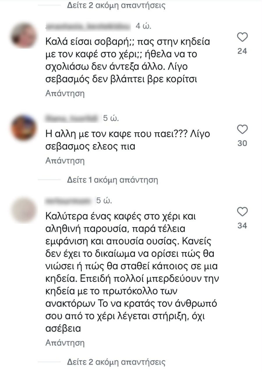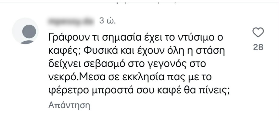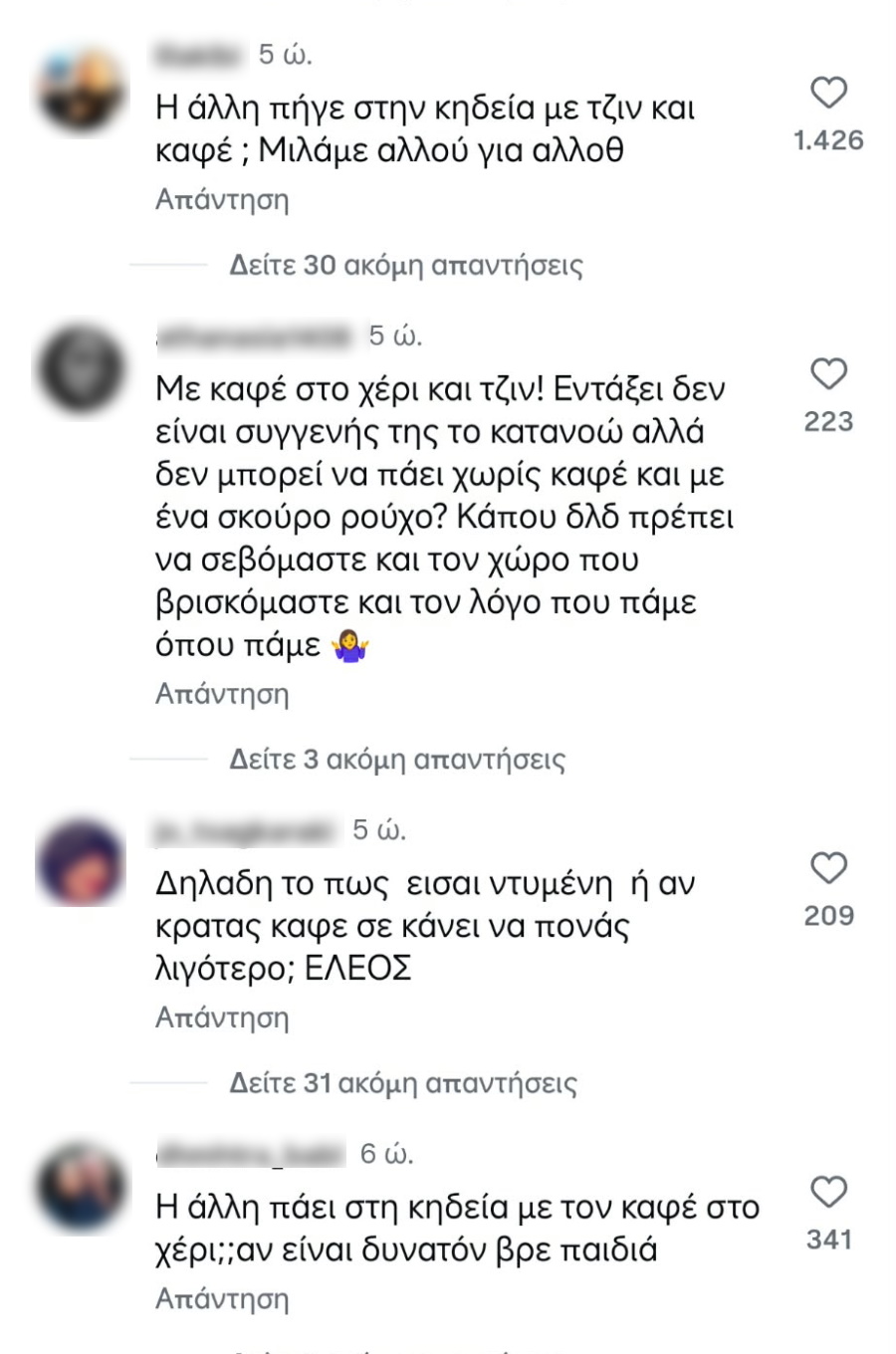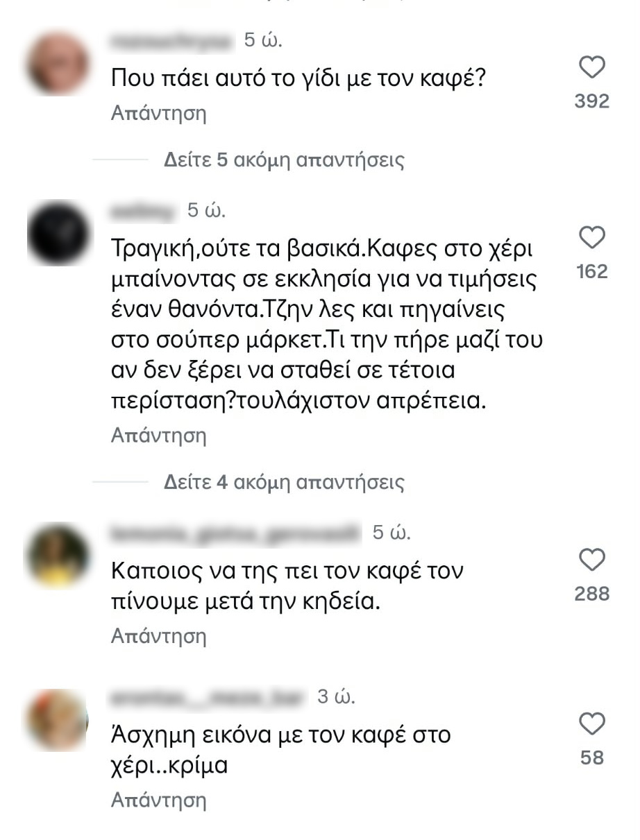 «Ούτε τα βασικά η Μαστορού… Η κυρία με τον καφέ και το τζινάκι περαστική είναι; Με τον καφέ στην κηδεία; Δεν άντεξε να τον πιει μετά; Η Αγρινιώτισσα με τον καφέ στο χέρι…» ήταν μερικά από τα αρνητικά σχόλια που γράφτηκαν κάτω από τις αναρτήσεις στα social media του TLIFE.