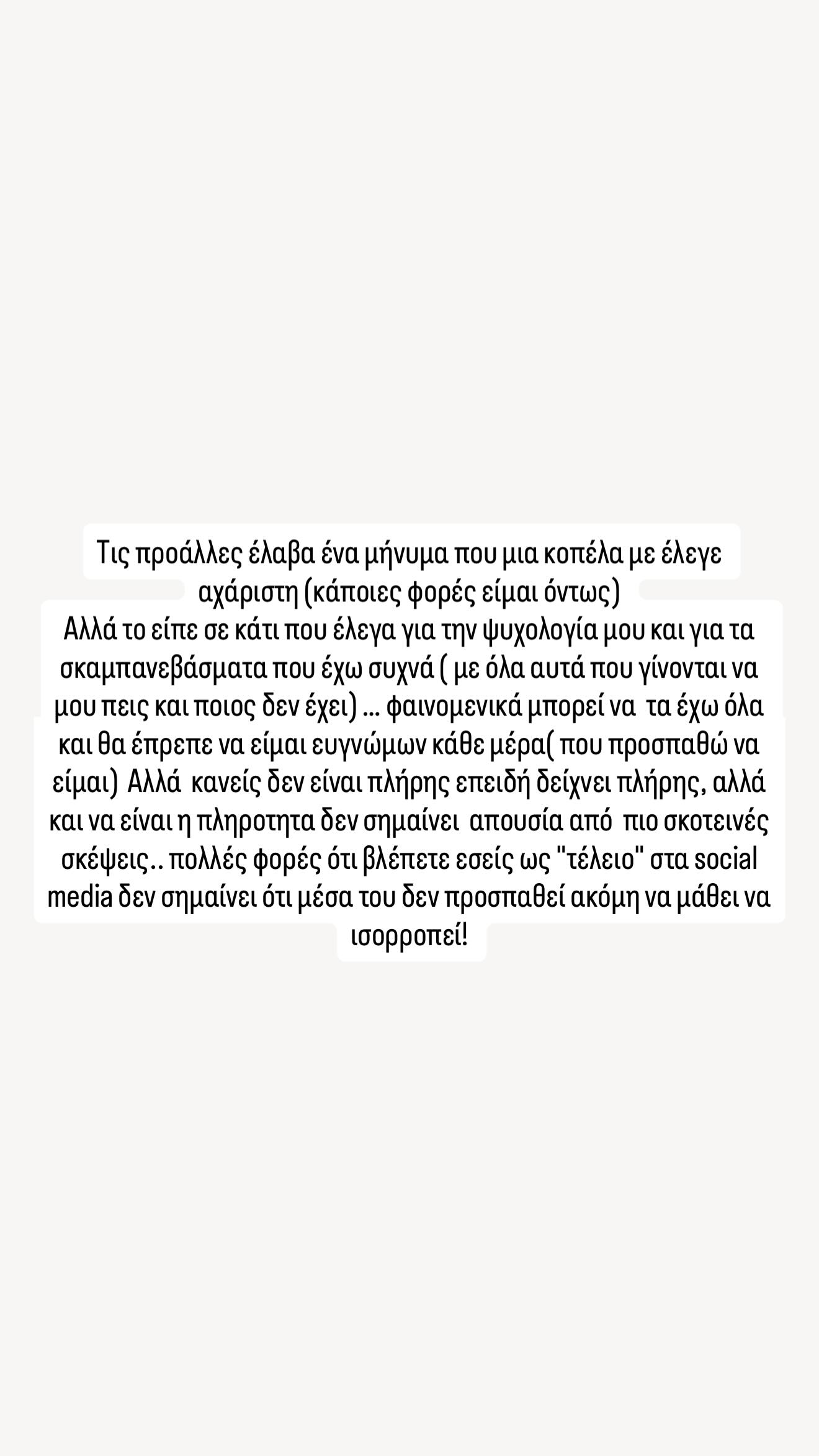 «Τις προάλλες έλαβα ένα μήνυμα που μια κοπέλα με έλεγε αχάριστη (κάποιες φορές είμαι όντως). Αλλά το είπε σε κάτι που έλεγα για την ψυχολογία μου και για τα σκαμπανεβάσματα που έχω συχνά (με όλα αυτά που γίνονται να μου πεις και ποιος δεν έχει) … φαινομενικά μπορεί να τα έχω όλα και θα έπρεπε να είμαι ευγνώμων κάθε μέρα (που προσπαθώ να είμαι).