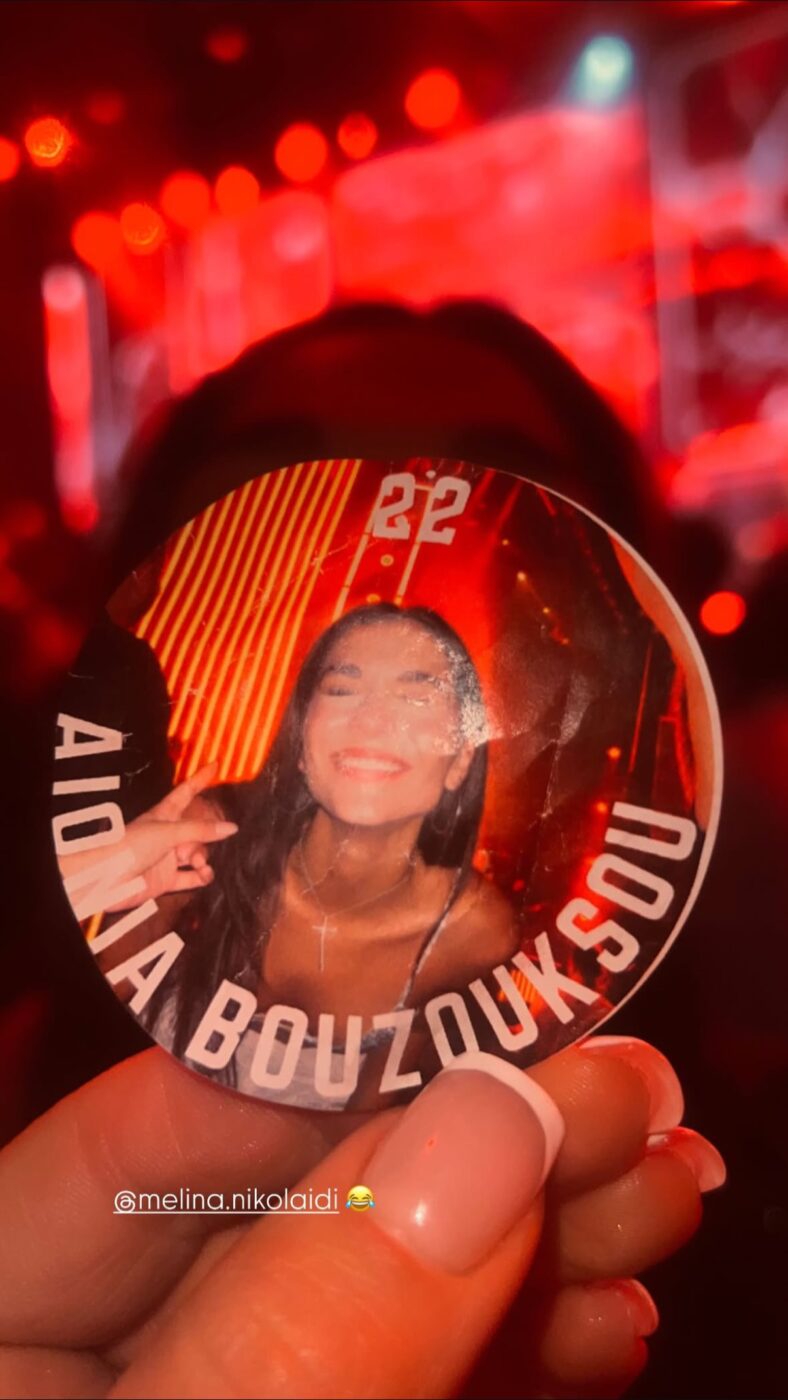 Σε άλλη ανάρτηση η Μελίνα Νικολαΐδη δείχνει τα αυτοκόλλητα που έφτιαξαν για εκείνη οι φίλοι της με μια φωτογραφία της από βραδινή της έξοδο και τη φράση, «Αιώνια μπουζουξού»
