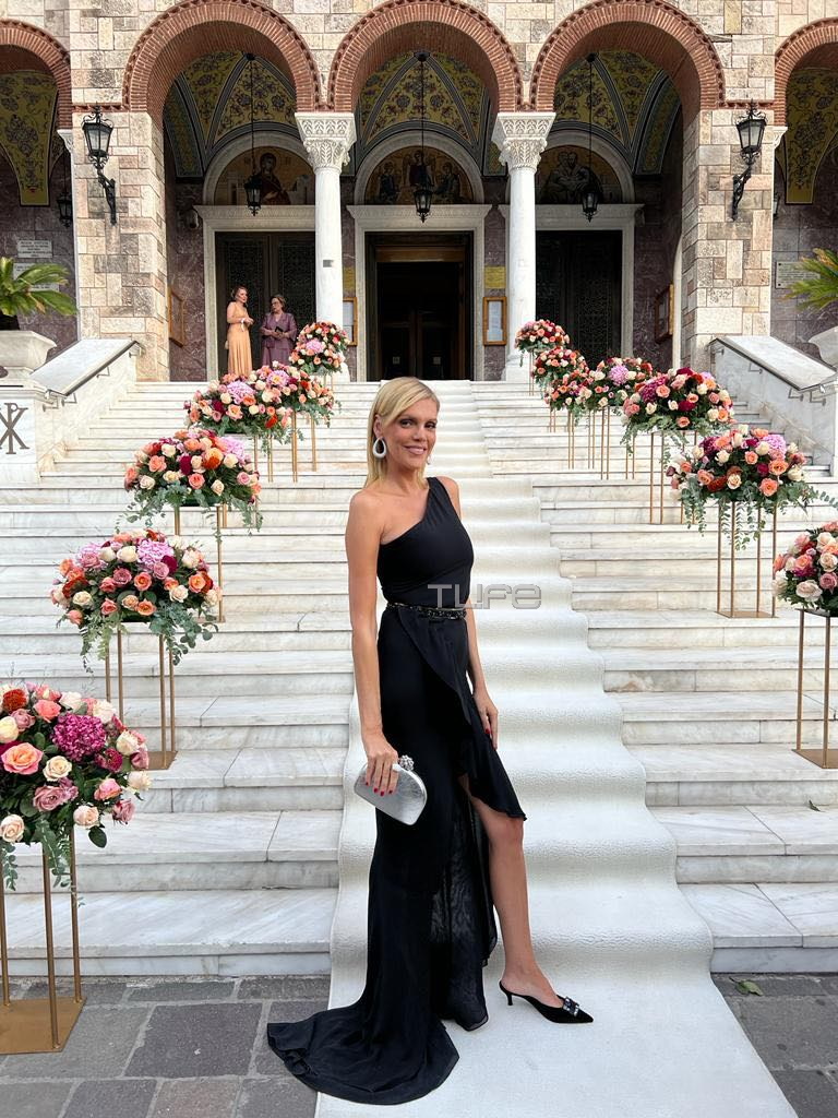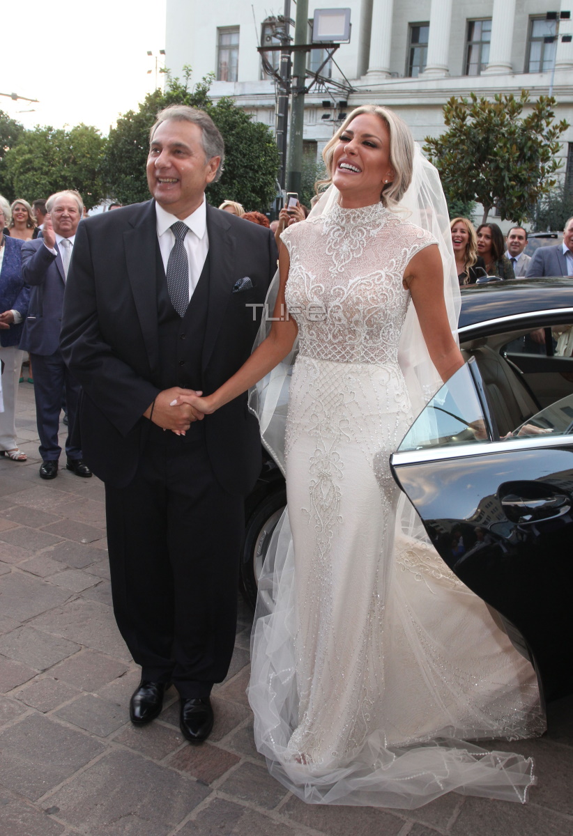 Η νύφη, λαμπερή και εντυπωσιακή με το δαντελένιο νυφικό της και το μακρύ βέλο, κατέφτασε στην εκκλησία συνοδευόμενη από τον πατέρα της, τον πρόεδρο Εμπορικού και Βιομηχανικού Επιμελητηρίου Πειραιά, Βασίλη Κορκίδη.
