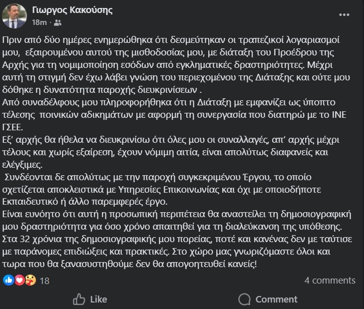 Ο Γιώργος Κακούσης γνωστοποίησε με ανάρτησή του ότι οι τραπεζικοί του λογαριασμοί δεσμεύτηκαν με διάταξη της Αρχής για τη Νομιμοποίηση Εσόδων από Εγκληματικές Δραστηριότητες, καθώς φέρεται να εμπλέκεται στην υπόθεση που αφορά στον πρόεδρο της ΓΣΕΕ Γιάννη Παναγόπουλο.