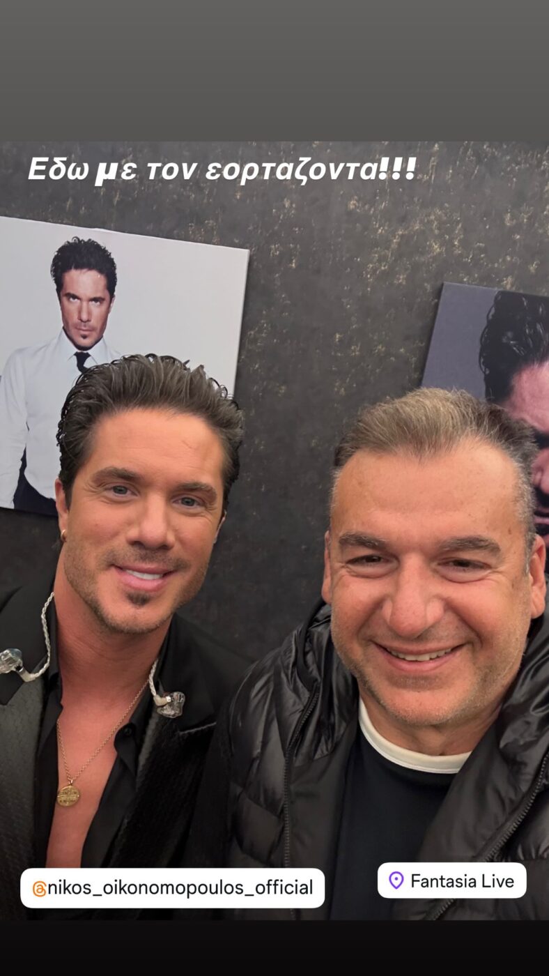 Λίγο μετά την πολυσυζητημένη συνέντευξη του τραγουδιστή στον παρουσιαστή, ο Γιώργος Λιάγκας διασκέδασε χθες βράδυ στον Νίκο Οικονομόπουλο και φυσικά βρέθηκε και στο καμαρίνι με τη σύντροφό του, Μαρία Αντωνά για να του ευχηθούν και από κοντά για την ονομαστική γιορτή του.