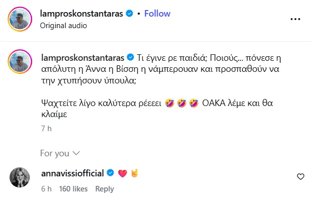 Kι ενώ όλα αυτά τα χρόνια η Άννα Βίσση συνηθίζει να μη δίνει σημασία σε δημοσιεύματα και φήμες, ένα σχόλιό της κάτω από την ανάρτηση του Λάμπρου Κωνσταντάρα, έρχεται να επιβεβαιώσει πως και εκείνη ταυτίζεται με την άποψή του, ότι κάποιοι προσπαθούν να τη «χτυπήσουν» και να τη σαμποτάρουν σε μια τόσο σημαντική στιγμή της ζωής και της καριέρας της.