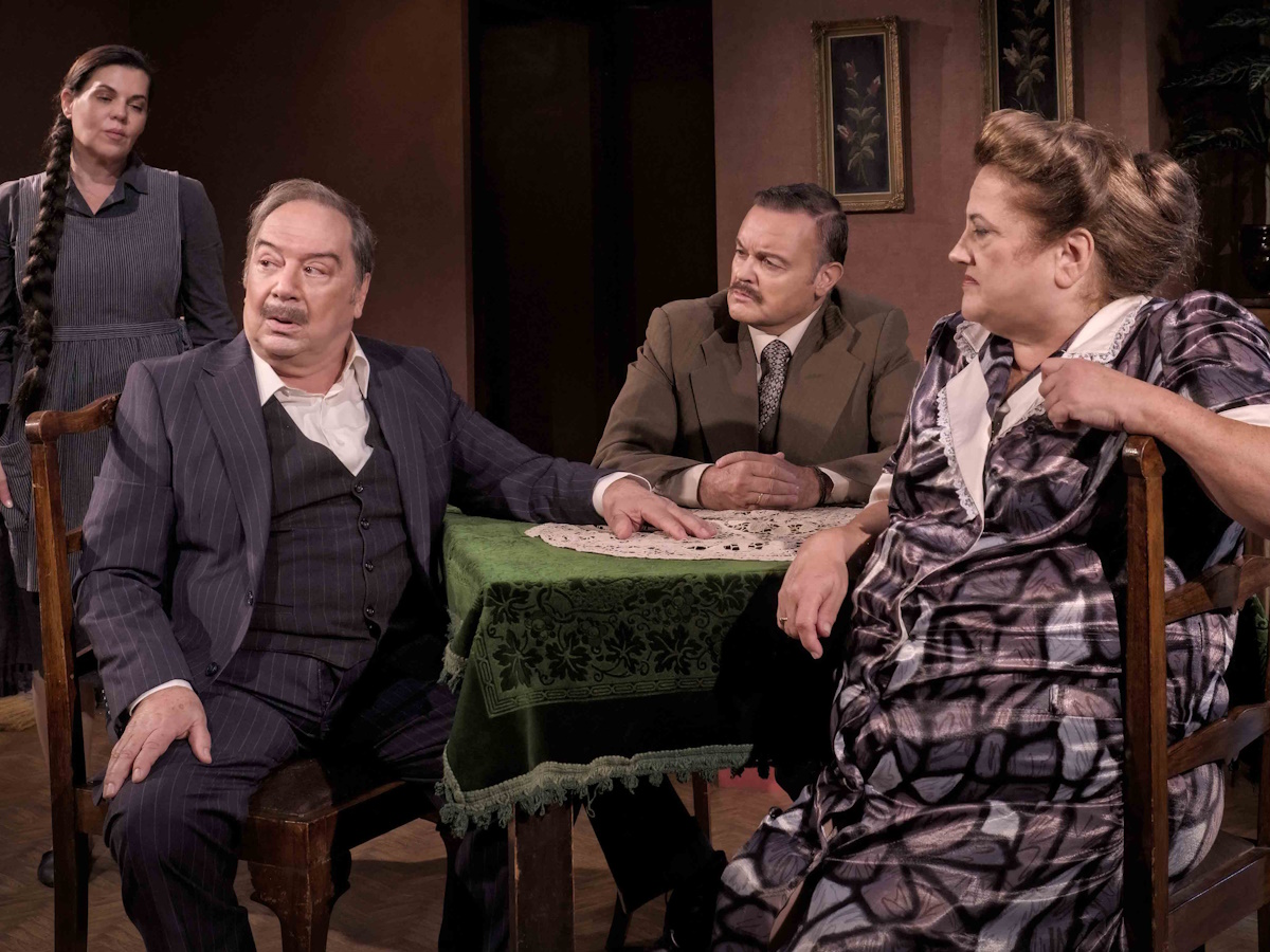Στην παράσταση στο Μικρό Παλλάς, ο Σταμάτης Φασουλής ερμηνεύει τον κυρ-Παντελή και η Ελένη Καστάνη τη σύζυγό του, Αθηνά. Ο Απόστολος Καμιτσάκης είναι ο Σταύρος, ο δεξιός γιός και ο Γιώργος Βουρδαμής, είναι ο Κώστας, ο αριστερός γιός.