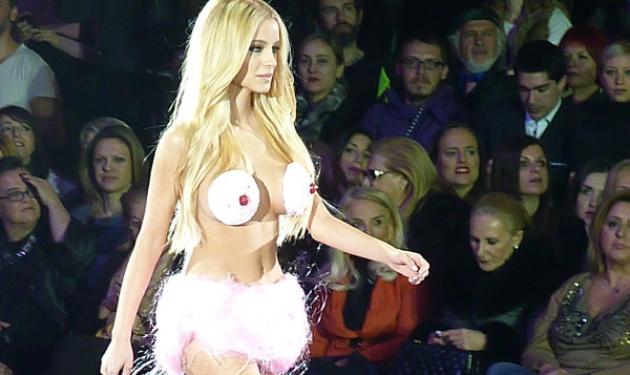 Το μοντέλο έκανε πασαρέλα φορώντας μίνι φούστα και στο στήθος της δύο… πεντανόστιμα cupcakes!