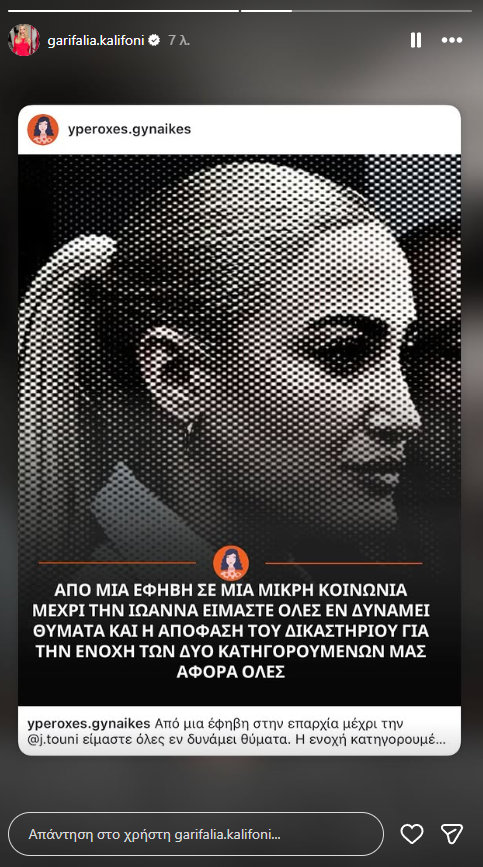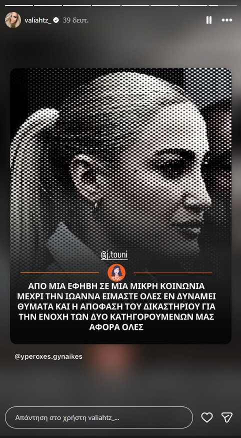 Λίγες ώρες μετά το τέλος της δίκης η Ιωάννα Τούνη ανέβασε στο instagram φωτογραφίες με όσους βρέθηκαν στο πλευρό της γράφοντας: «ΕΝΟΧΟΙ ΓΙΑ ΚΑΚΟΥΡΓΗΜΑ οι δύο κατηγορούμενοι με ποινή φυλάκισης 4 και 3 χρόνια αντίστοιχα!!!