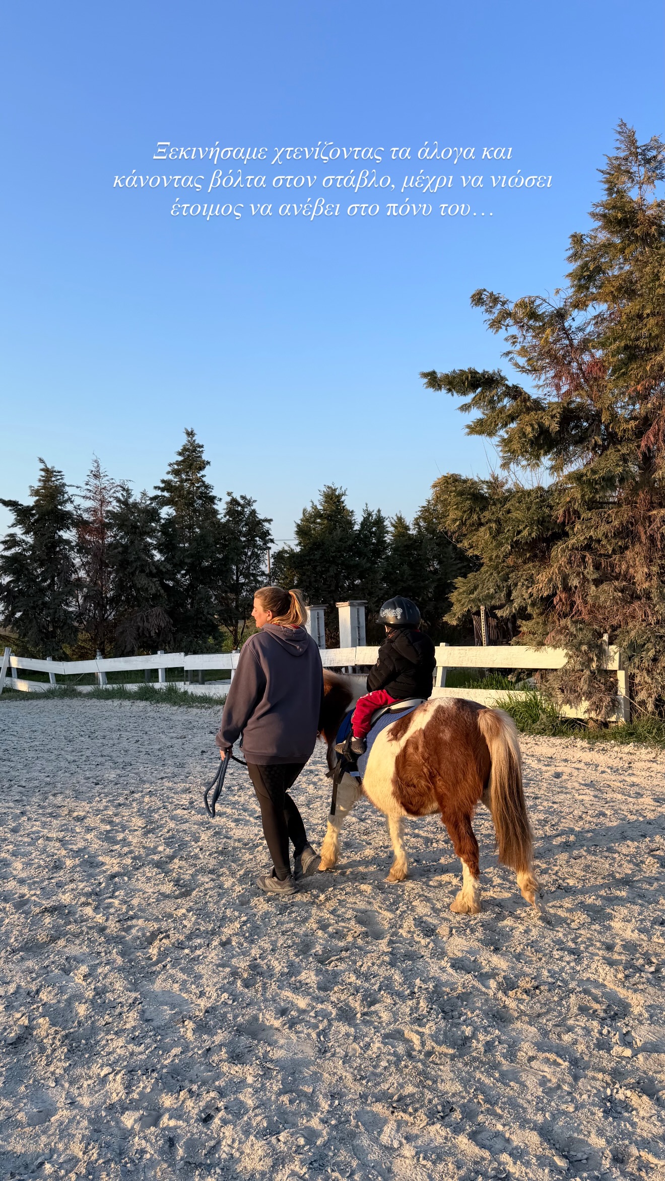 «Ξεκινάμε χτενίζοντας τα άλογα και κάνοντας βόλτα στον στάβλο, μέχρι να νιώσει έτοιμος να ανέβει στο πόνυ του», ανέφερε αρχικά η Ιωάννα Τούνη στην πρώτη φωτογραφία με τον γιο της, Πάρη.