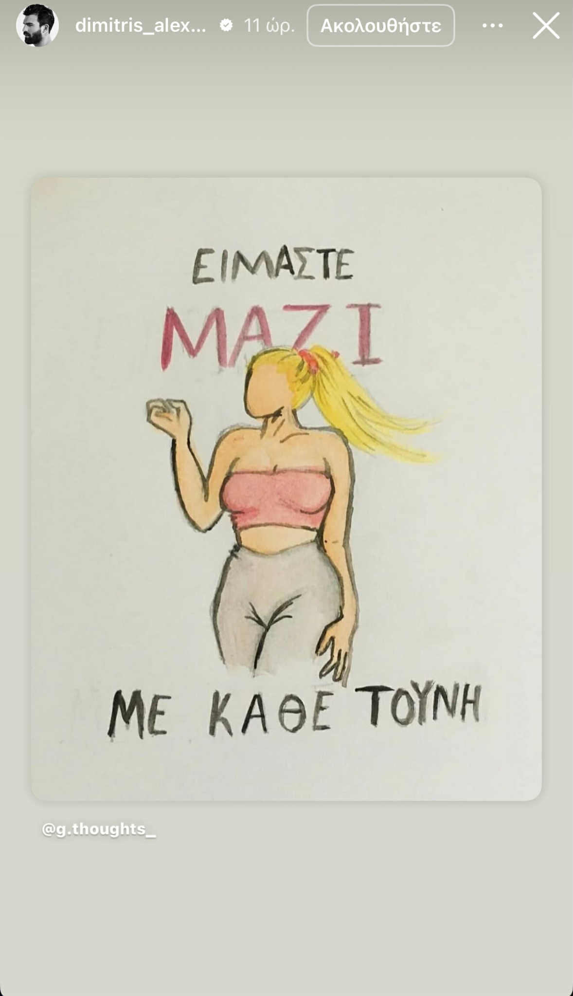 «Είμαστε μαζί με κάθε Τούνη» γράφει η εικόνα που αναδημοσίευσε ο Δημήτρης Αλεξάνδρου, μετά τα όσα είπε η πρώην σύντροφός του για την έναρξη της δίκης του revnge porn βίντεο.