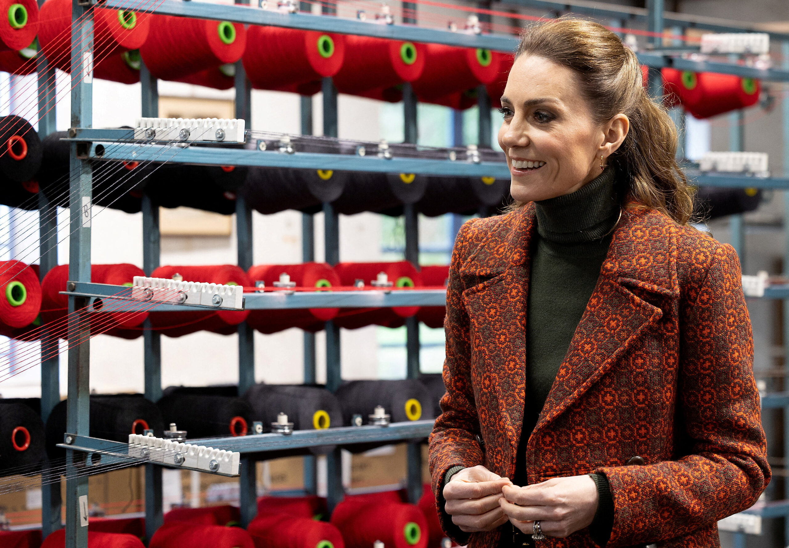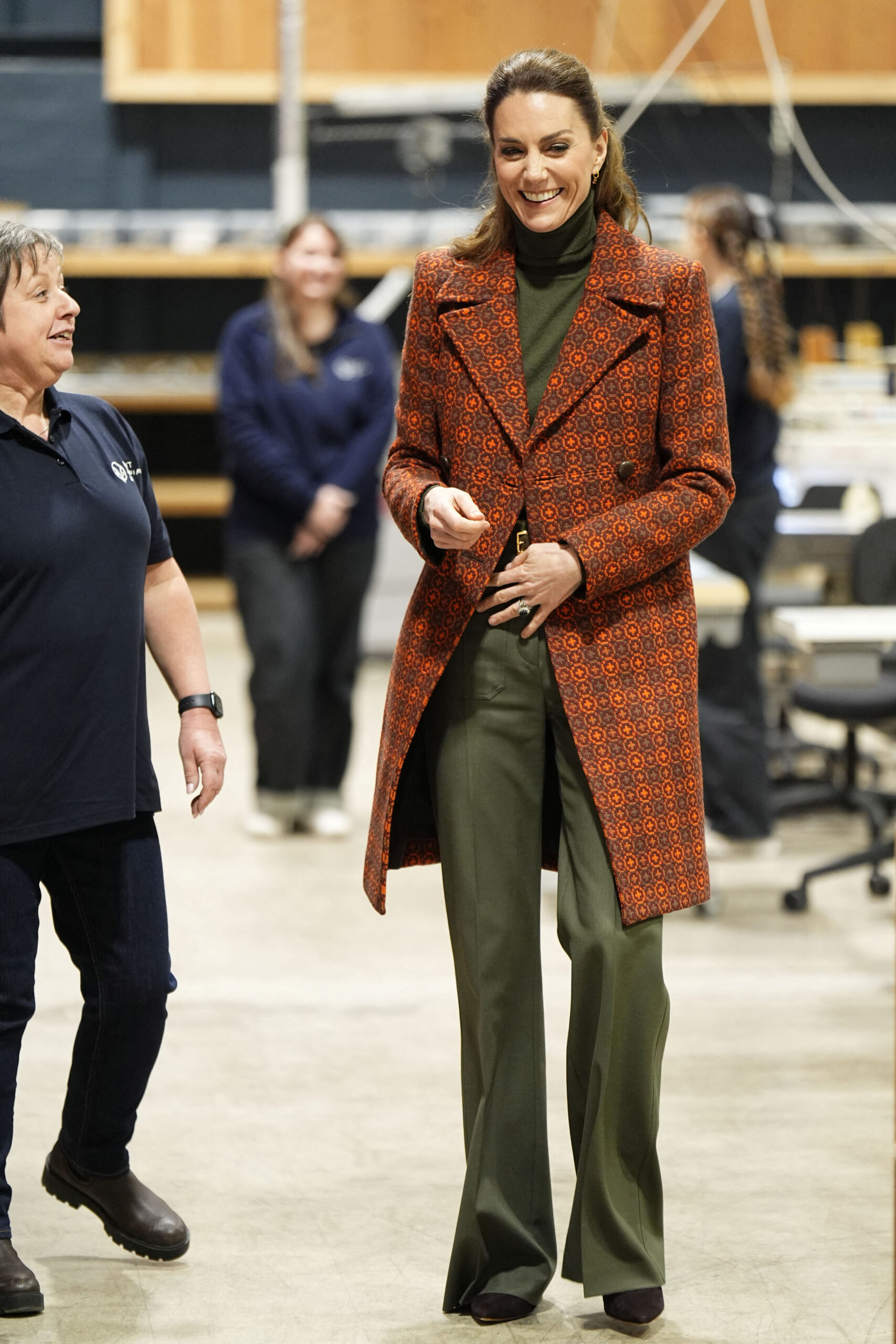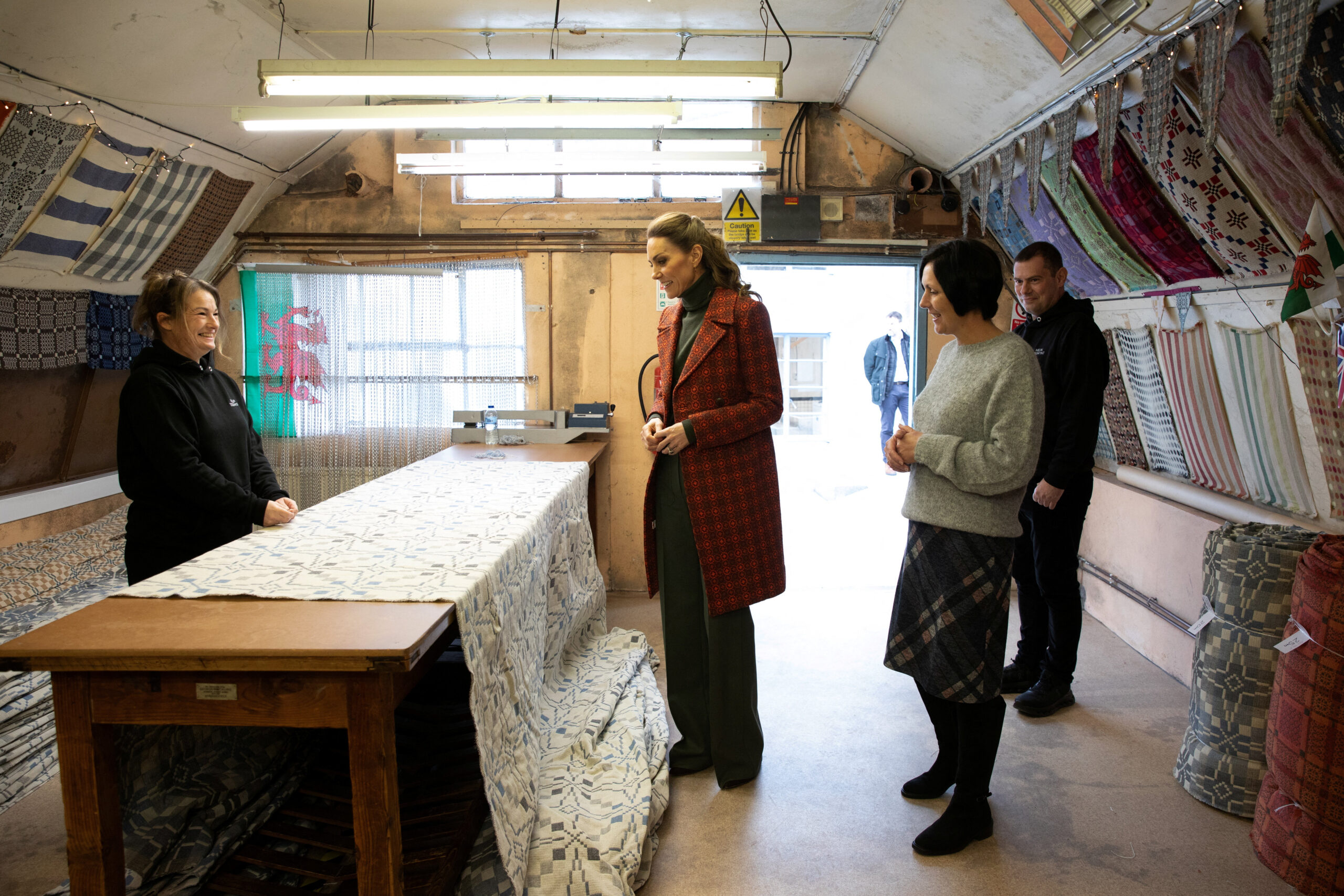 Η Kate Middleton βρέθηκε αρχικά στο ιστορικό εργοστάσιο μαλλιού Melin Tregwynt στο Pembrokeshire, το οποίο λειτουργεί αδιάλειπτα από το 1841. Για την περίσταση επέλεξε ένα κομψό παλτό στα χρώματα της ουαλικής σημαίας, αποτίοντας φόρο τιμής στην τοπική παράδοση. Το σύνολό της ολοκληρώθηκε με χακί παντελόνι από τη χειμερινή συλλογή της Victoria Beckham και κασμιρένιο πουλόβερ σε γήινους τόνους.