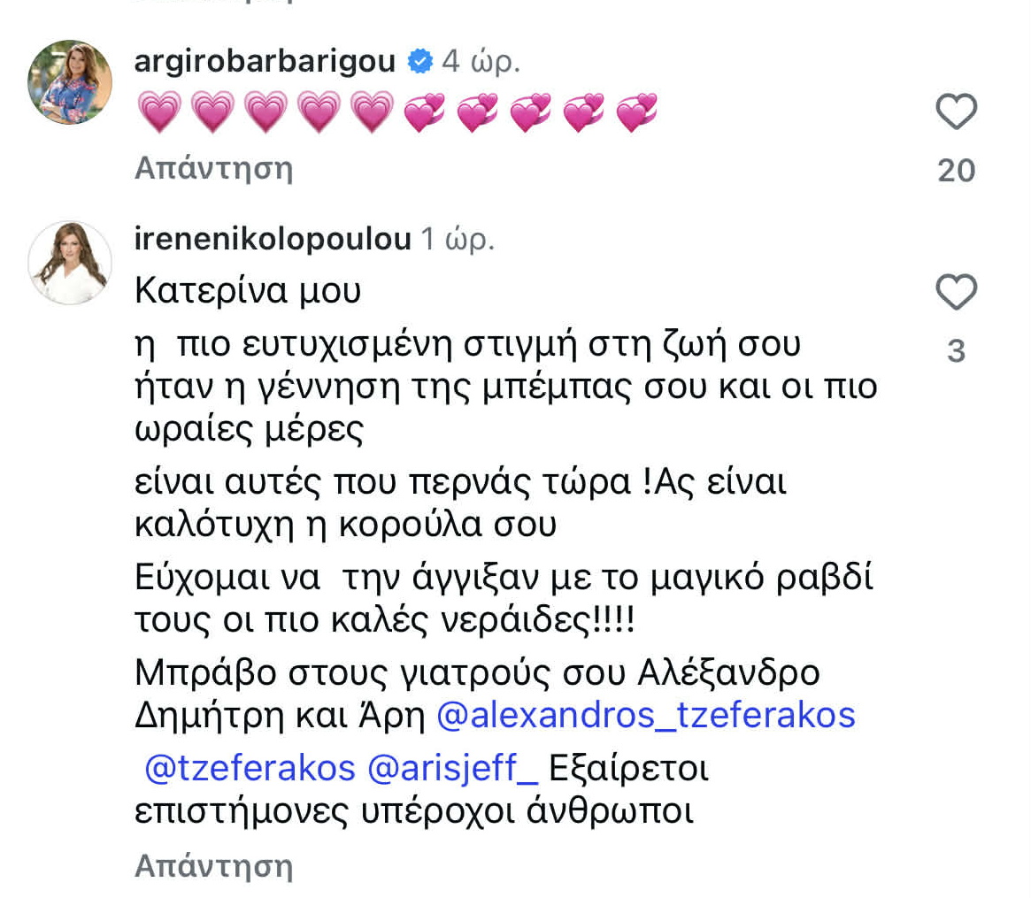 Στη μακροσκελή λεζάντα της, η Κατερίνα Καινούργιου δεν έκρυψε τη συγκίνησή της, γράφοντας μεταξύ άλλων: «Καλώς ήρθες, μικρό μας θαύμα… Από τη στιγμή που σε κράτησα στην αγκαλιά μου, η ζωή μου απέκτησε άλλο νόημα», εκφράζοντας παράλληλα την ευγνωμοσύνη της προς τους γιατρούς και τη μαία που στάθηκαν δίπλα της σε αυτή τη μοναδική εμπειρία. (δες εδώ την ανάρτησή της)