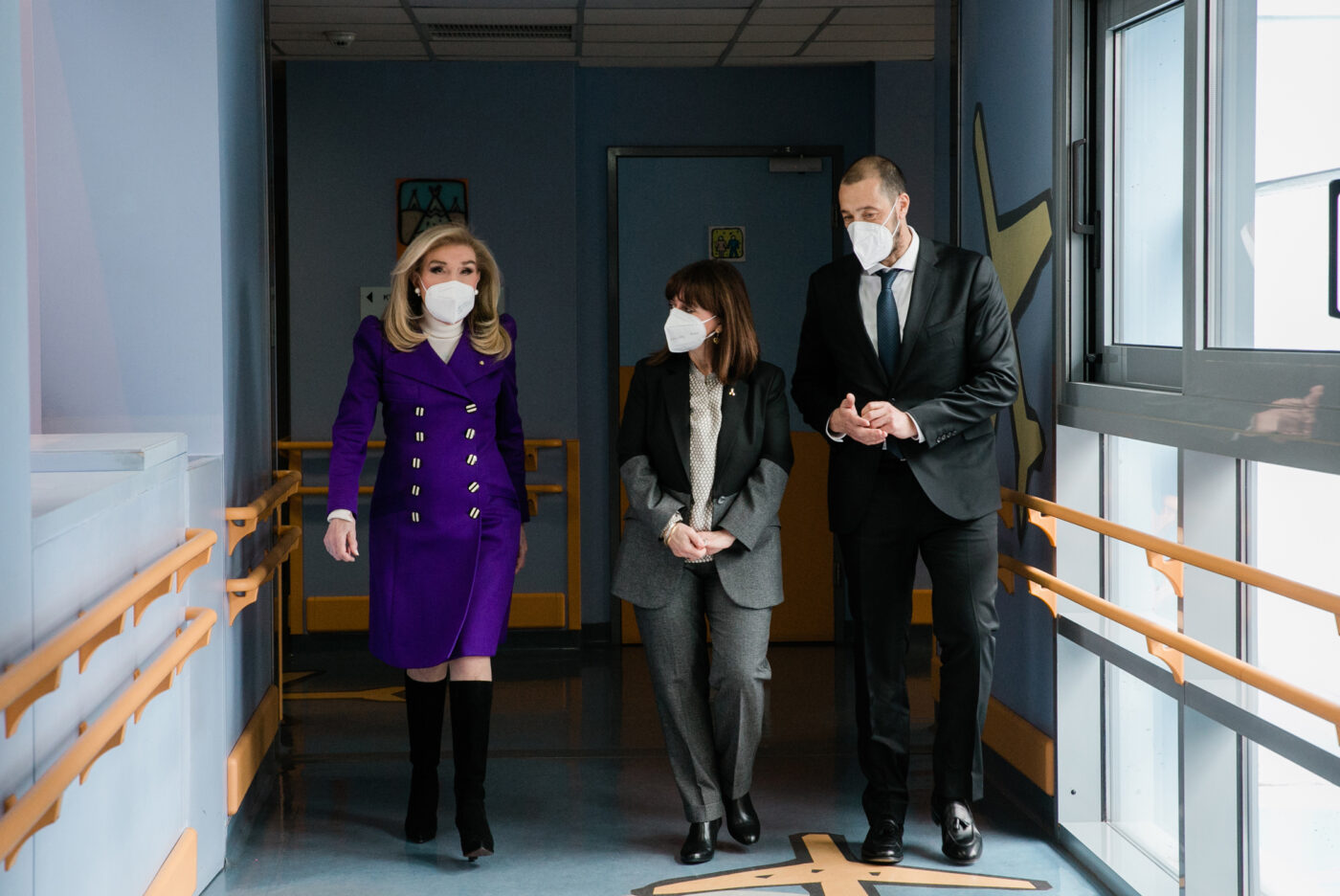 Την κυρία Σακελλαροπούλου υποδέχτηκαν η Πρόεδρος του Σωματείου «ΕΛΠΙΔΑ-Σύλλογος Φίλων Παιδιών με καρκίνο» κυρία Μαριάννα Β. Βαρδινογιάννη και ο κοινός Διοικητής των Νοσοκομείων Παίδων «Η ΑΓΙΑ ΣΟΦΙΑ» και «Π.&Α. Κυριακού» κύριος Μανώλης Παπασάββας.