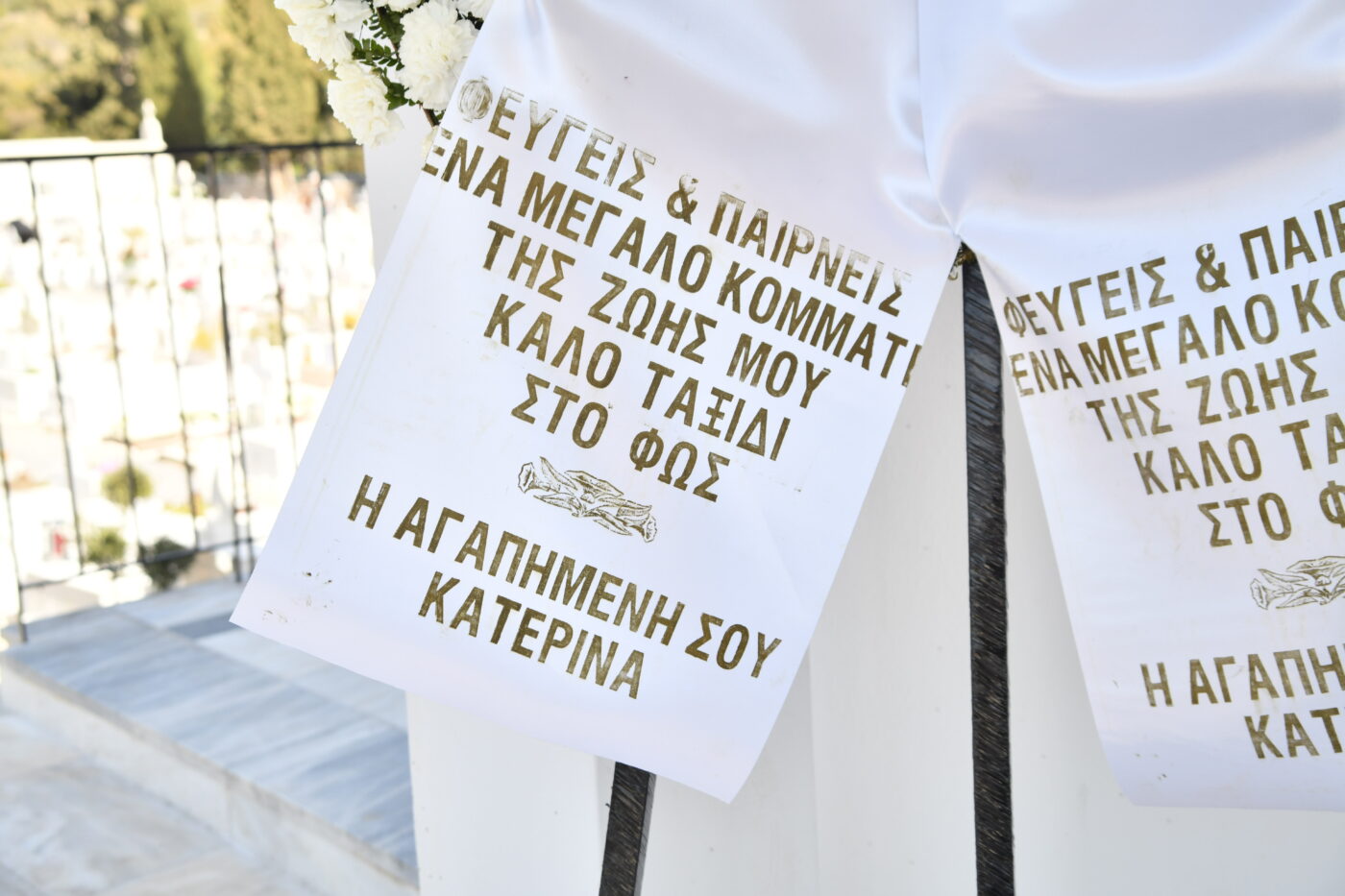 «Φεύγεις και παίρνεις ένα μεγάλο κομμάτι της ζωής μου. Καλό ταξίδι στο φως!», ήταν το μήνυμα στο στεφάνι, με «υπογραφή»… η αγαπημένη σου Κατερίνα.