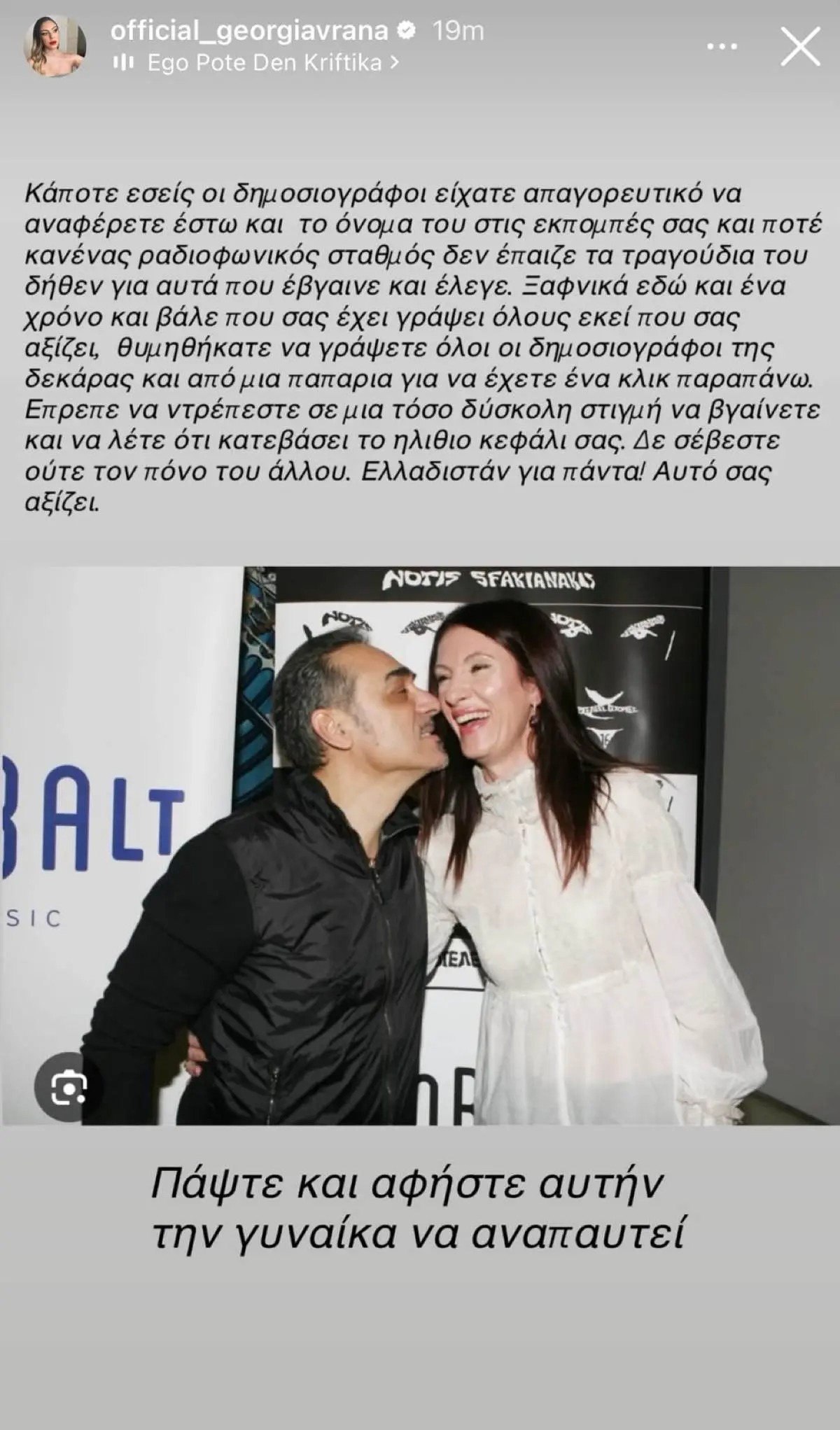 Μέσα από το προσωπικό της προφίλ στο Instagram, η Γεωργία Βρανά «τα έβαλε» με όλους όσοι είχαν τα τελευταία χρόνια «απαγορευτικό» να προβάλλουν τον Νότη Σφακιανάκη στις εκπομπές τους.