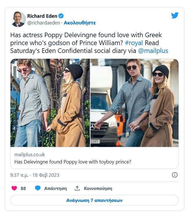 Μάλιστα, όπως αναφέρουν τα διεθνή media ο 24χρονος εγγονός του τέως βασιλιά Κωνσταντίνου διατηρεί σχέση με την… 36χρονη Poppy Delevingne. Παρά τα 12 χρόνια διαφοράς τους, ο Κωνσταντίνος Αλέξιος και η αδερφή του διάσημου μοντέλου Cara Delevingne ζουν ένα τρυφερό ειδύλλιο.