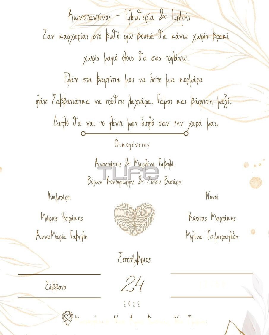 Τα δυο μυστήρια πρόκειται να πραγματοποιηθούν σήμερα και όπως θα δεις στο προσκλητήριο του ζευγαριού που εξασφάλισε αποκλειστικά το TLIFE το όνομα που θα πάρει ο γιους τους είναι Ερμής ενώ νονοί θα είναι ο Κώστας Μαρτάκης και η καλή τους φίλη Μελίνα Τσιμπρακλίδη.