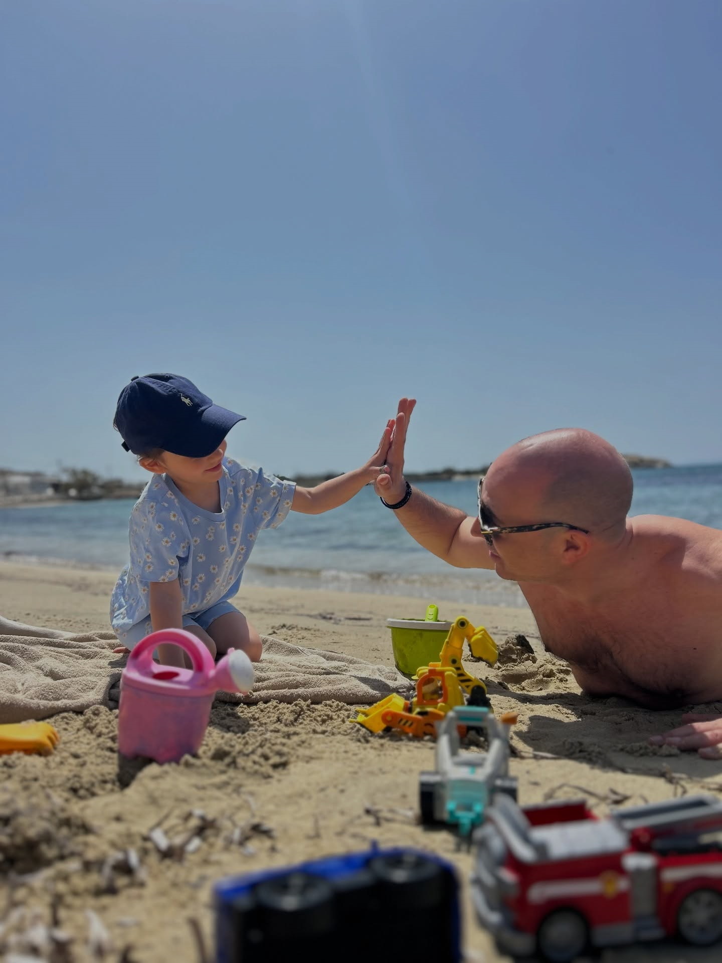 Σε μια από τις φωτογραφίες, βλέπουμε τον Κωνσταντίνου Μπογδάνο να απολαμβάνει ξέγνοιαστες στιγμές στην αμμουδιά μαζί με την κόρη του παίζοντας δίπλα στη θάλασσα.