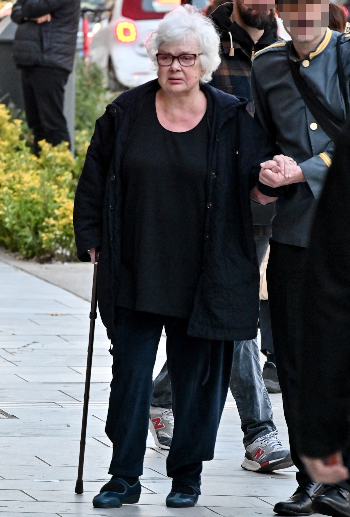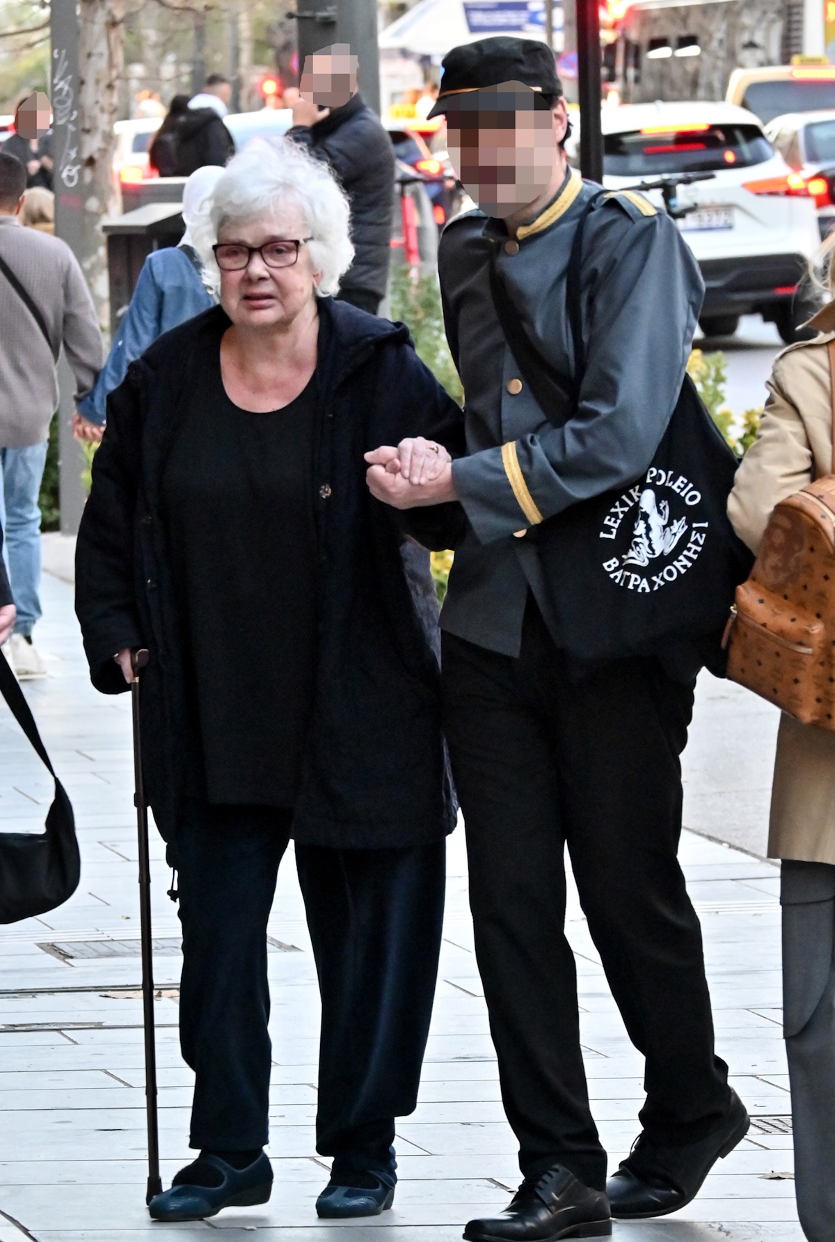 Όπως θα δεις στα στιγμιότυπα, η Ξένια Καλογεροπούλου φορούσε μαύρα και περπατούσε με τη βοήθεια του μπαστουνιού της. Ένας άνδρας τη συνόδευε στη βόλτα της.