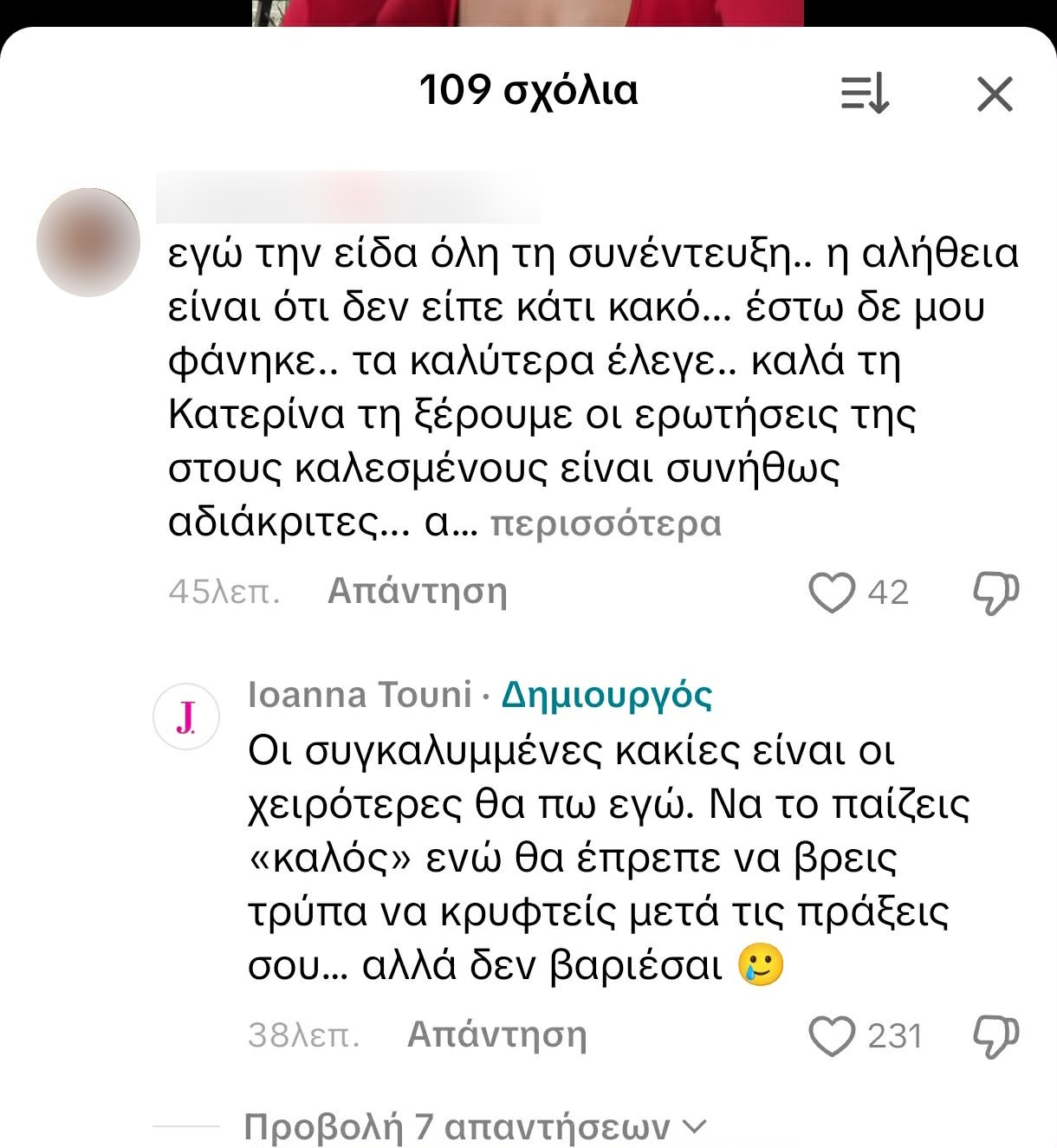 Ωστόσο, το ξέσπασμα δεν έμεινε στο βίντεο καθαυτό. Η Ιωάννα Τούνη απάντησε σχεδόν σε όλα τα σχόλια που της έκαναν οι follower της στο TikTok, τονίζοντας μεταξύ άλλων: «Οι συγκαλυμμένες κακίες είναι οι χειρότερες θα πω εγώ. Να το παίζεις «καλός» ενώ θα έπρεπε να βρεις τρύπα να κρυφτείς μετά τις πράξεις σου… αλλά δεν βαριέσαι. Έχει και η υπομονή όρια… Άσε με να γνωρίζω καλύτερα. Με τις συνεντεύξεις που μου έστειλαν σήμερα τι να κάνω…» γράφει χωρίς κανέναν δισταγμό η Influencer και επιχειρηματίας, αναφερόμενη φυσικά στον Δημήτρη Αλεξάνδρου.