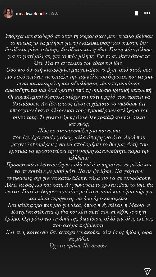 Και κάθε φορά που μια γυναίκα όπως η Αγγελική, η Μαρία, η Κατερίνα στέκεται όρθια και λέει αυτό που συνέβη, ανοίγει δρόμο. Όχι μόνο για τη δική της δικαίωση, αλλά για όλες εκείνες που φοβούνται ακόμα. Και αν η κοινωνία δεν αντέχει να ακούει, τότε ίσως ήρθε η ώρα να μάθει. Όχι να κρίνει. Να ακούει»