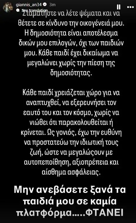 Ως γονιός, έχω την ευθύνη να προστατεύω την ιδιωτική τους ζωή, ώστε να μεγαλώσουν με αυτοπεποίθηση, αξιοπρέπεια και αίσθημα ασφάλειας. Μην ανεβάσετε ξανά τα παιδιά μου σε καμία πλατφόρμα… ΦΤΑΝΕΙ» γράφει ο Γιάννης Αντετοκούνμπο.
