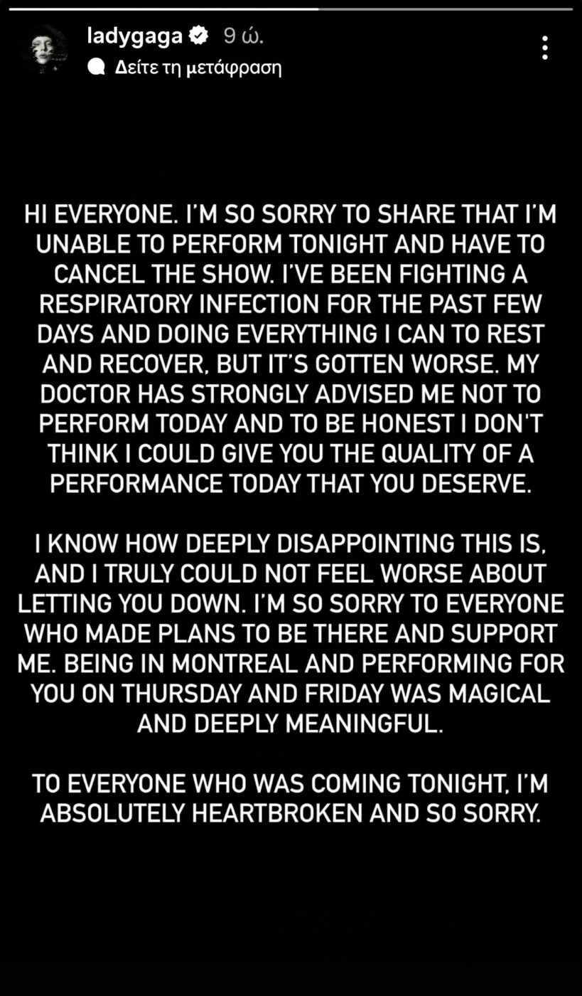 Ξέρω πόσο απογοητευτικό είναι αυτό. Και πραγματικά δεν θα μπορούσα να νιώθω χειρότερα που σας απογοητεύω. Λυπάμαι πολύ για όλους όσοι έκαναν σχέδια να είναι εκεί και να με στηρίξουν. Το να βρίσκομαι στο Μόντρεαλ και να εμφανίζομαι για εσάς την Πέμπτη και την Παρασκευή ήταν μαγικό και βαθιά σημαντικό για μένα. Για όποιον θα ερχόταν σήμερα στο live είμαι απόλυτα συντετριμμένη και λυπάμαι τόσο» γράφει η Lady Gaga.