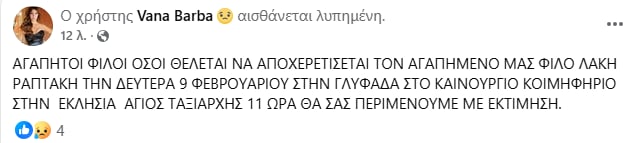 «Αγαπητοί φίλοι, όσοι θέλετε να αποχαιρετήσετε τον αγαπημένο μας φίλο Λάκη Ραπτάκη, τη Δευτέρα 9 Φεβρουαρίου, στη Γλυφάδα στην εκκλησία του Αγίου Ταξιάρχη, στις 11:00. Θα σας περιμένουμε. Με εκτίμηση» έγραψε η γνωστή ηθοποιός στο facebook.